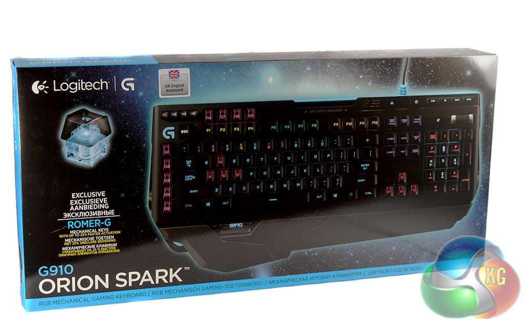 Logitech highlight the product via a large image of the keyboard. The front shows a little break down image of the Romer-G key switch, designed by Logitech for the G910.