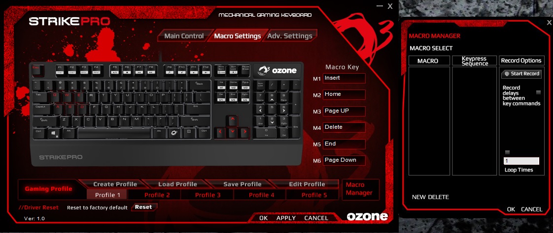 You have six macro keys in total to play with. You can also have up to five different profiles. Recording a macro was easy, you can even set up delays between key commands and how many times you want the action to loop. However I did find software to be quite sluggish even on a high end system.
