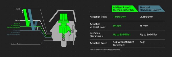 For the last couple of years, Razer has been manufacturing its own specification mechanical switches in partnership with Kailh. Thanks to Razer's own design tweaks, these switches are rated for swifter actuation and a longer life span.