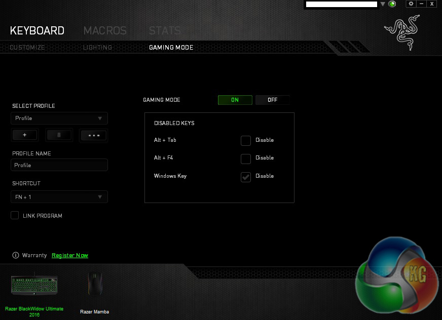 The Gaming mode tab allows you to switch the feature on or off. There are also some tweaks to be found, like disabling ALT+TAB and ALT+F4 as well as the Windows key.