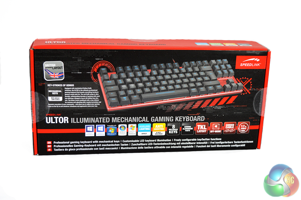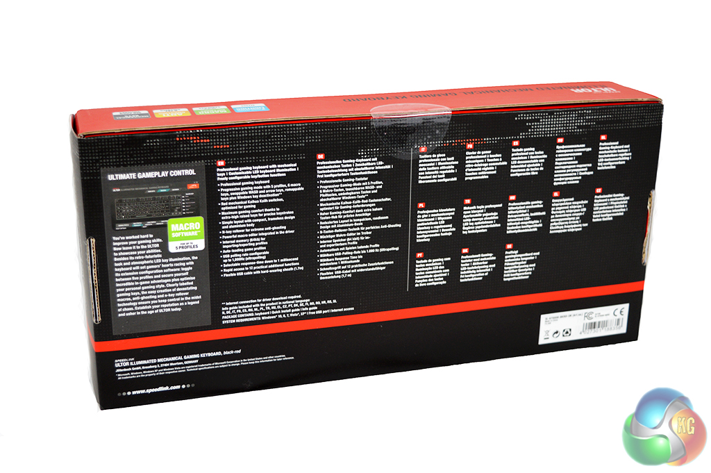 The Speedlink Ultor is a compact keyboard, so it also comes in compact packaging. On the front of the box, you will find a picture of the keyboard itself, along with a long list of supported software. The back of the box goes into a bit more detail on features in a number of languages.