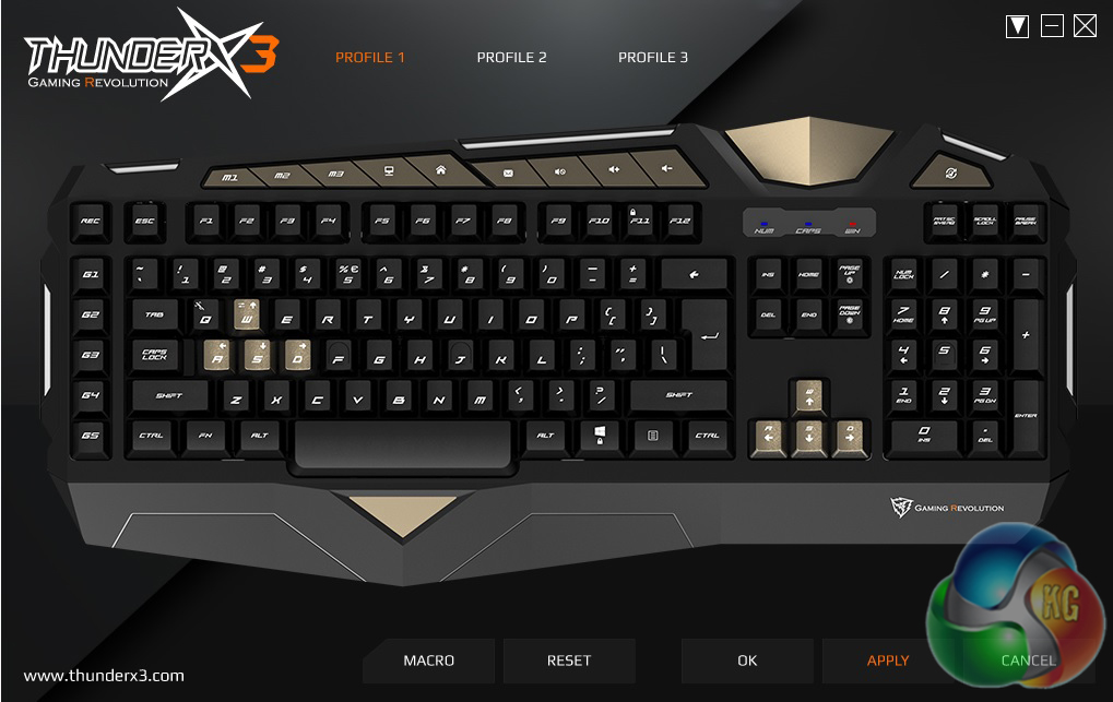 Upon first launching the ThunderX3 software, you will be greeted with the above window. From here, you can switch profiles or click on individual keys to set a new function, whether it be a macro, media control or a program function like minimising a window, or copying some text.