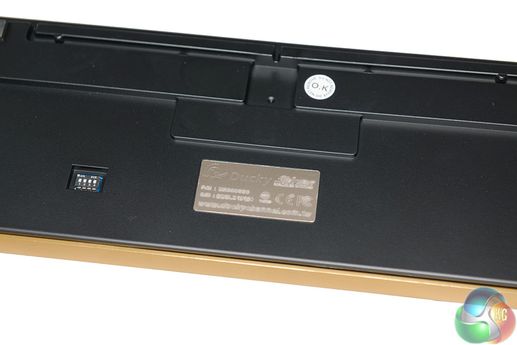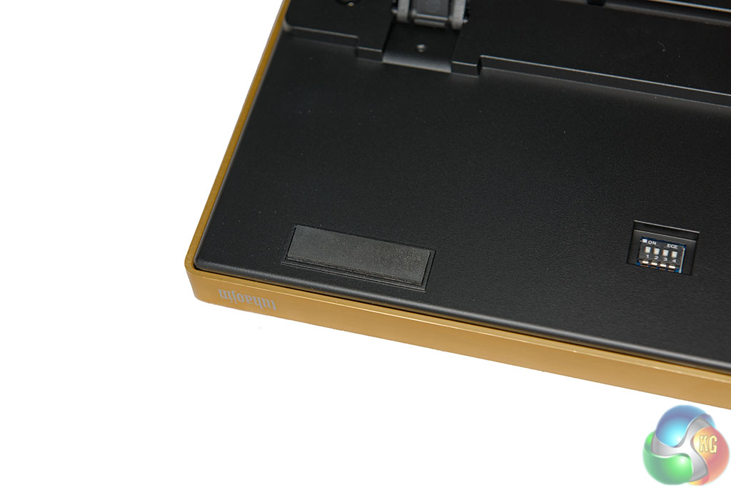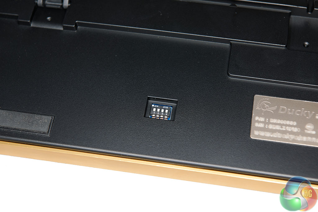 Under the keyboard are a little series of DIP switches. These let you adjust Windows Key Lockout, Control and Capslock key swap, Windows Key and Alt swap and DEMO mode.