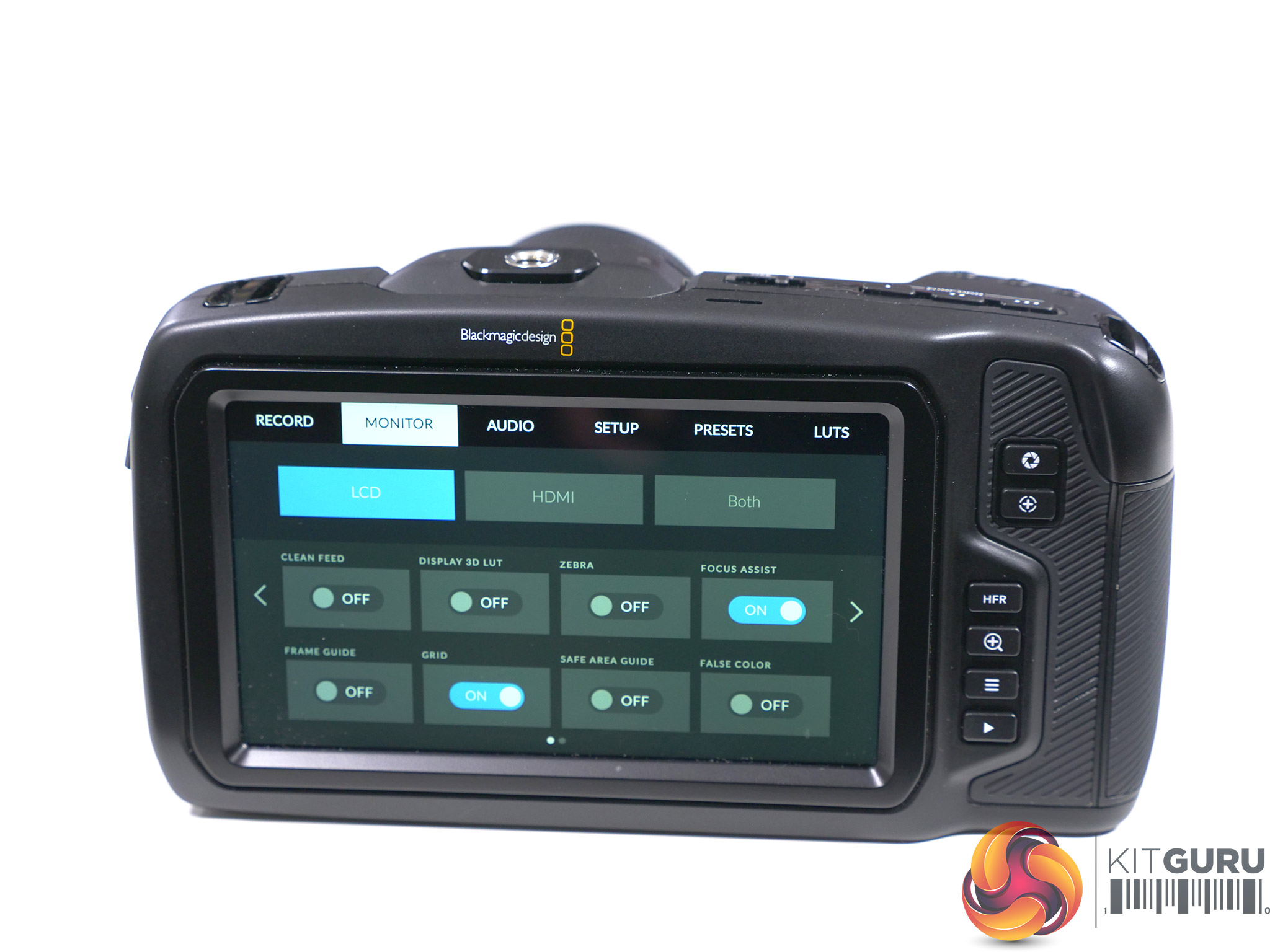 - LCD supports on screen overlays including status, histogram, focus peaking, and transport controls.