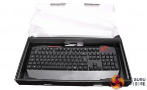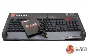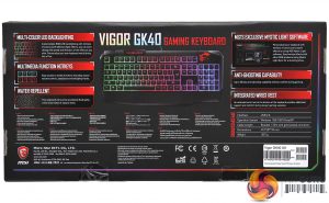 The GK40 product box follows the MSI trend of ‘mostly black with a bit of red’. The graphics tell you exactly what to expect inside and the ‘info bubbles’ tell you to expect multi-colour LED backlighting, multimedia function hotkeys, anti-ghosting, an integrated wrist wrest, a water-repellent design and MSI’s Mystic Lighting Software (but more on that later).