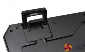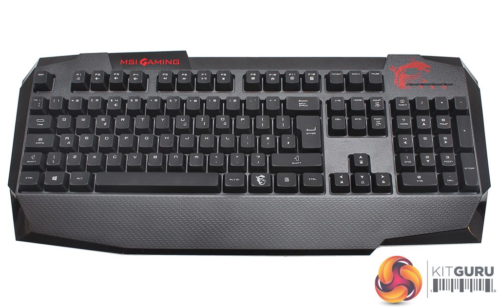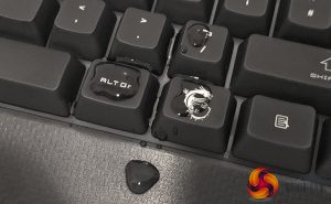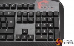 The GK40 houses its 104 raised keys in a really nice looking plastic exoskeleton giving it a lightweight feel but with some flex. The palm rest is integrated to the keyboard itself and while it doesn’t have a grippy feel to it, it still provides some comfort for long gaming sessions. Lucky, the MSI dragon, makes an appearance in the top right corner of the keyboard and there is an illuminated MSI logo top left.