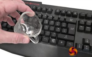 We conducted a simple test on the keyboard's ability to resist liquid. We applied water, let it pool, shook it all out and plugged the keyboard into the PC. It worked fine.