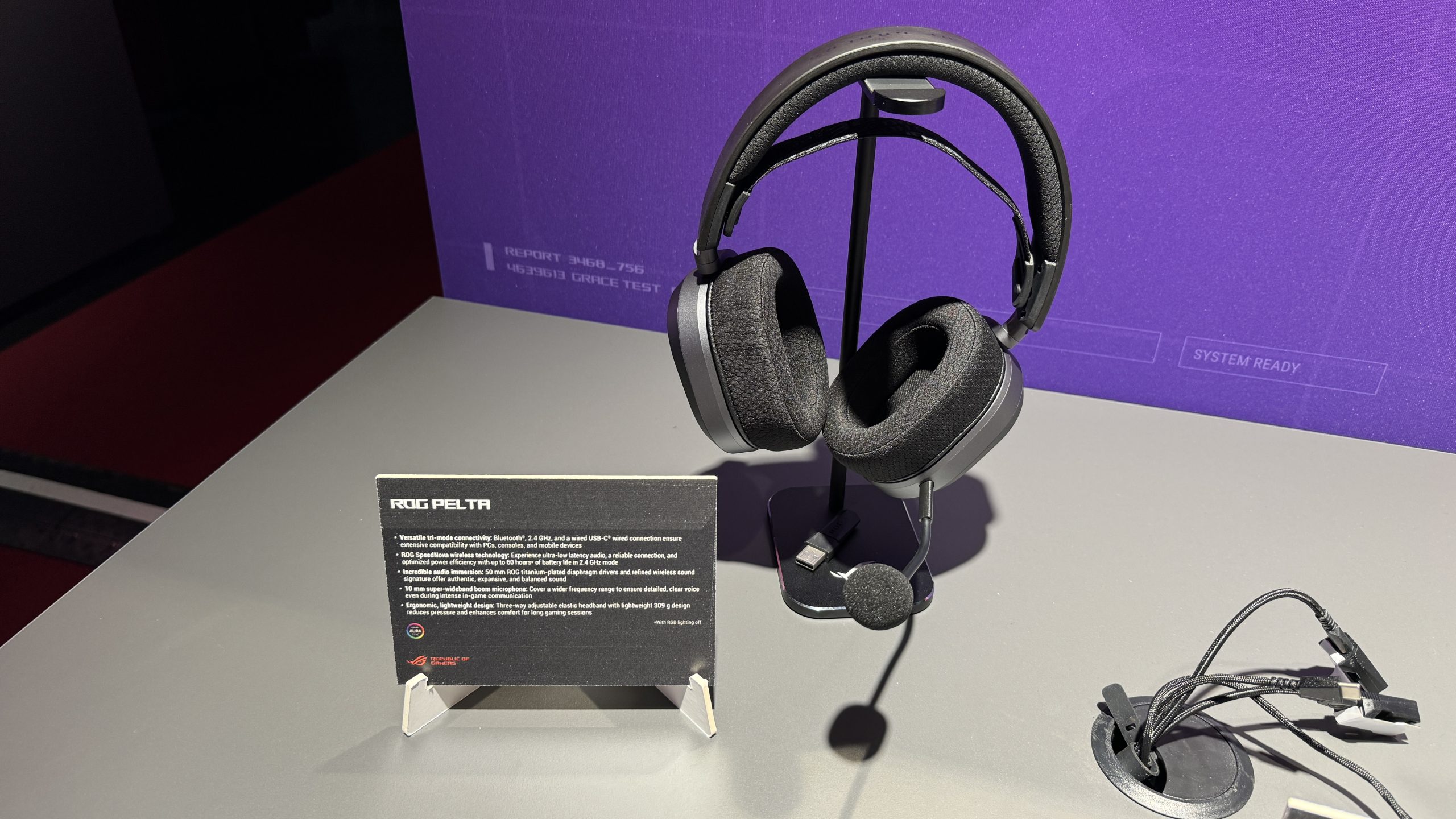 Finally, we have the ROG Pelta Gaming Headset, a new wireless headset that also utilises Asus's low-latency ROG SpeedNova 2.4GHz technology. Alternatively, you can use it wired via USB, so it will be compatible with PCs, Macs, PS4 and PS5 consoles and the Nintendo Switch. The headset is powered by ROG-exclusive 50mm titanium-plated diaphragm drivers with a 20Hz to 20kHz frequency range. For comms, you'll be relying on a 10mm super-wideband boom microphone.