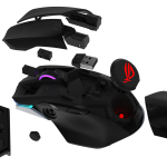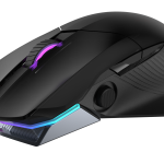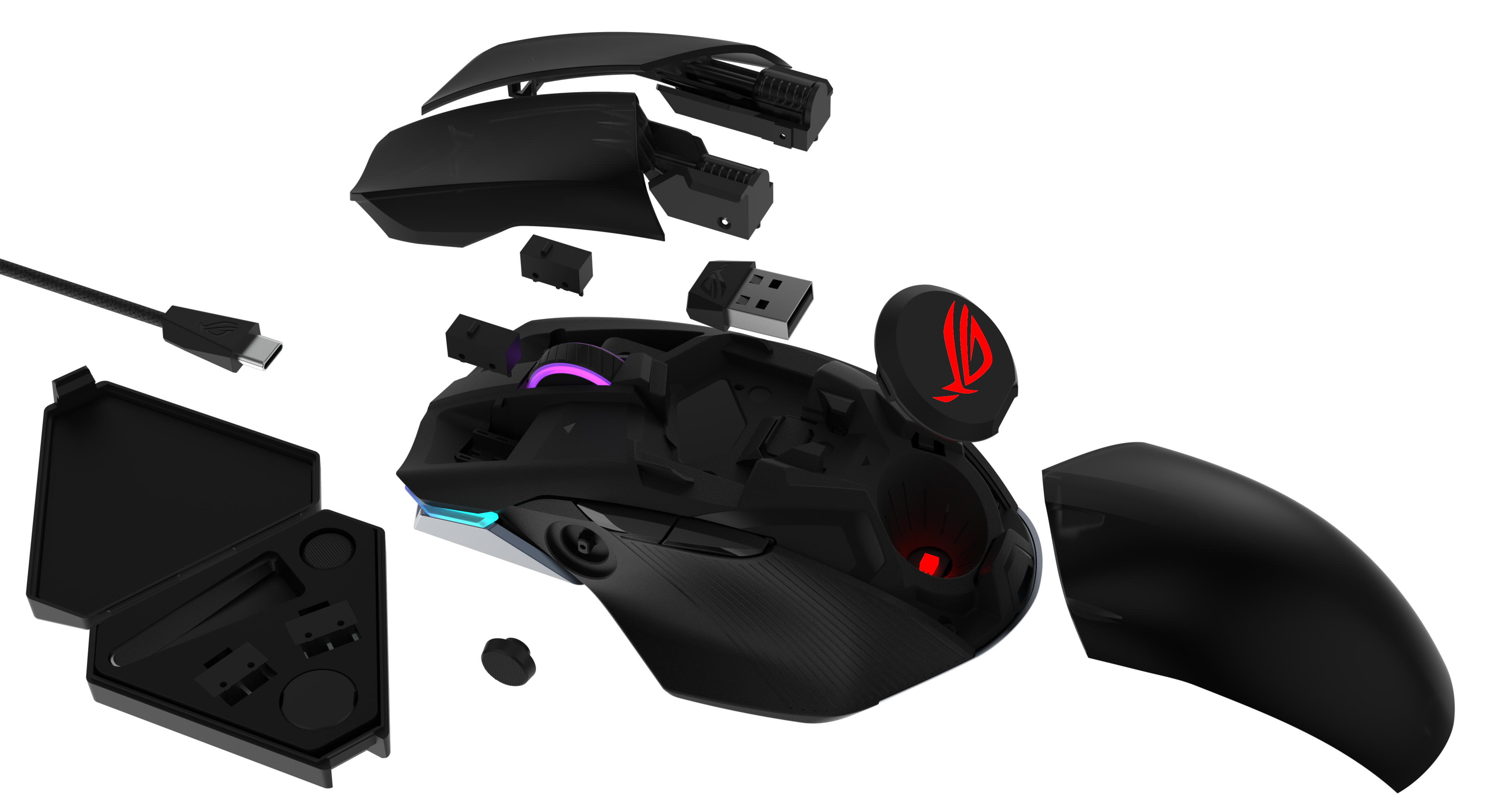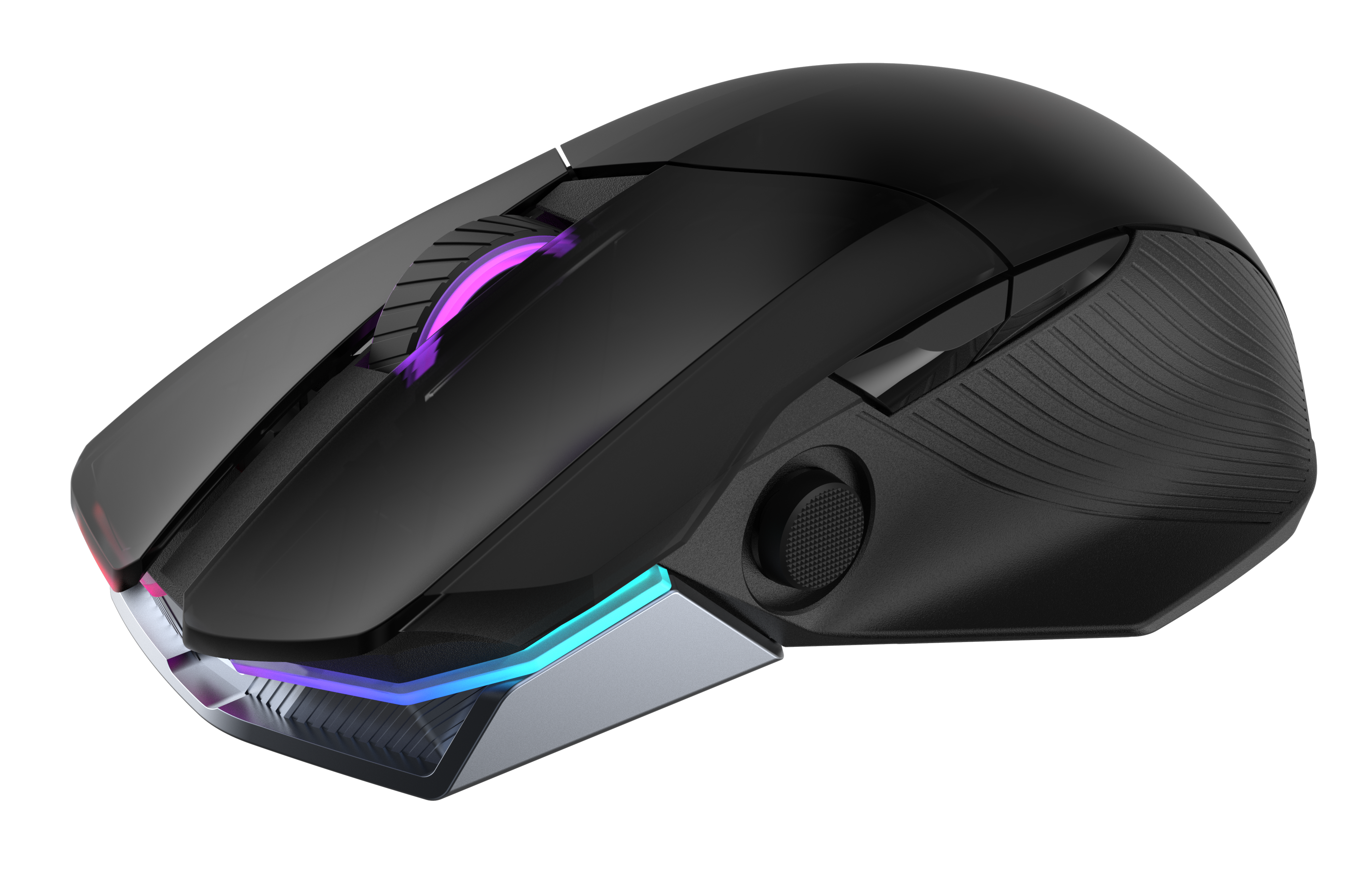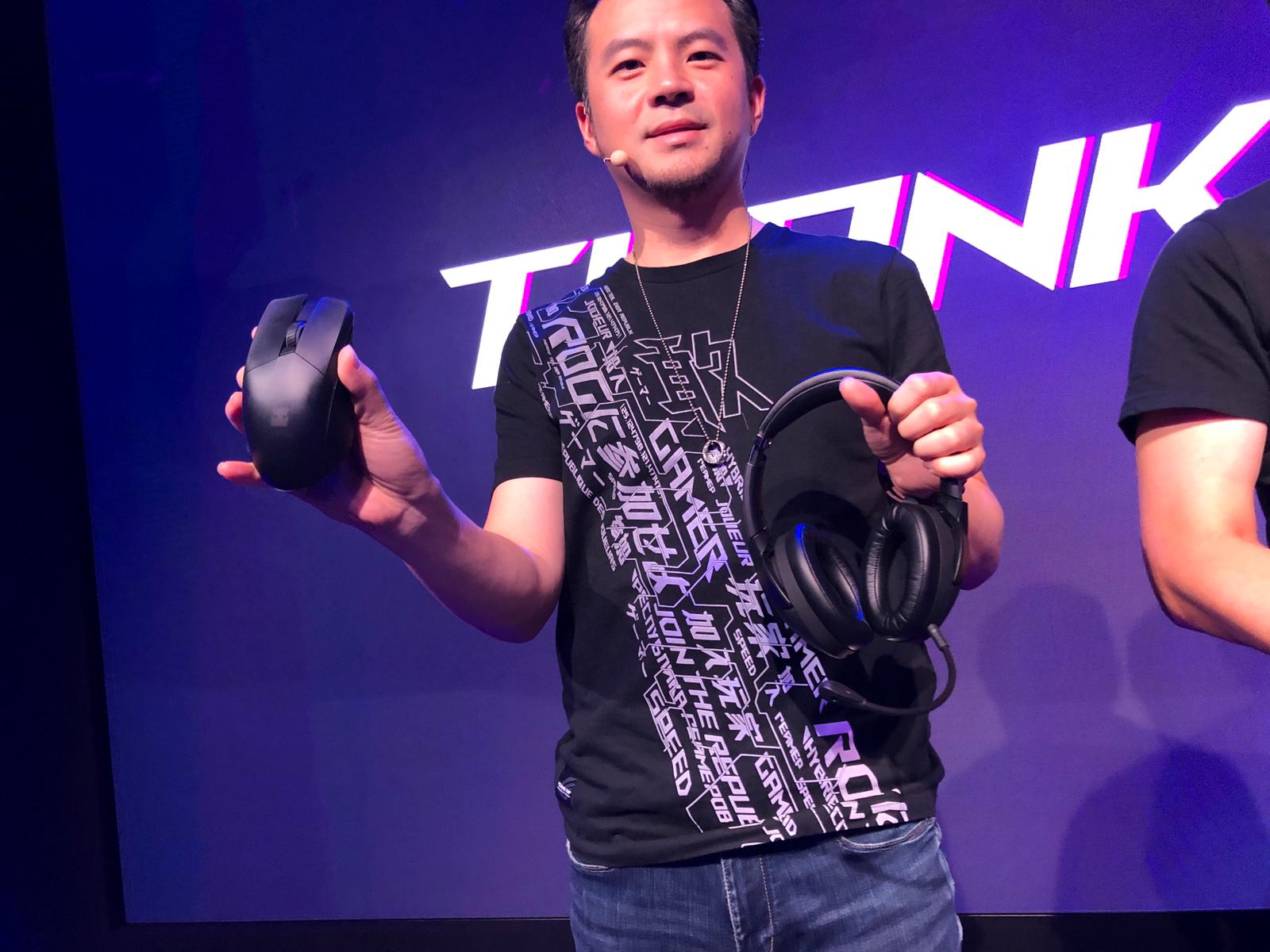 Finally, we have two new wireless gaming peripherals coming, the ROG Chakram mouse and the ROG Strix Go 2.4 headset. The mouse features an optical sensor and Qi wireless charging, an integrated joystick for gamepad-like movement control and re-programmable buttons. While this mouse can be charged in wireless mode, plugging it in also has some advantages, with 15 minutes of charging time providing 12 hours of life.