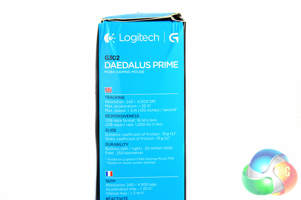 The side lists several key specifications, such as the maximum DPI, glide efficiency and the life expectancy of the left and right mouse buttons. Our review unit shipped from Germany and the packaging was badly mistreated by the courier.