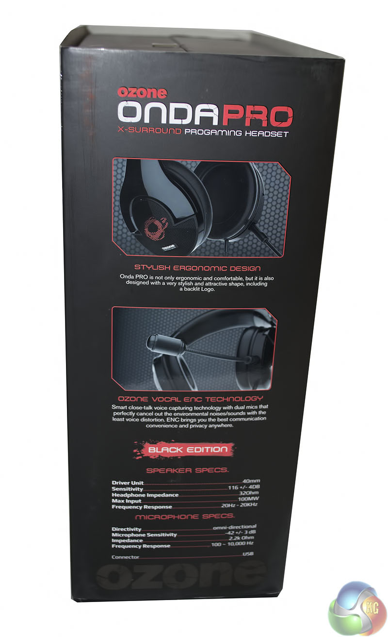 The Ozone Onda Pro headset comes packaged in a plain but sturdy black cardboard box with a product sleeve wrapped around it.