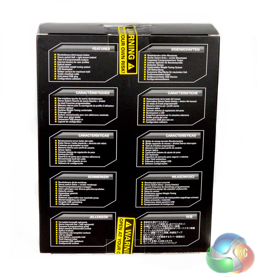 The Shark Zone M20 comes in an appropriately sized box with a magnetic flap on the front, revealing the mouse inside. The back of the box on the other hand boasts key features, such as the Omron mouse switches, optical sensor and nine re-programmable buttons.