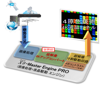 The Sharp Aquos 4K Next LC-80XU30 television also has a powerful X8-Master Engine Pro system-on-chip that can upconvert content in full-HD (1920*1080) and 4K UHD (3840*2160) resolutions to 8K UHD (7680*4320) internally and then display it on the 4K screen, which improves quality and adds details not seen on typical 4K TVs. While Sharp does not discuss algorithms it uses, they should be similar to traditional super sampling antialiasing as well as recently introduced AMD’s VSR (virtual super resolution) and Nvidia’s DSR (dynamic super resolution) technologies. Sharp's RGBY panel could theoretically be instrumental in such virtual upconversion, but Sharp does not explicitly confirm this. To further enhance quality, the TV supports Sharp’s Mega Contrast technology.
