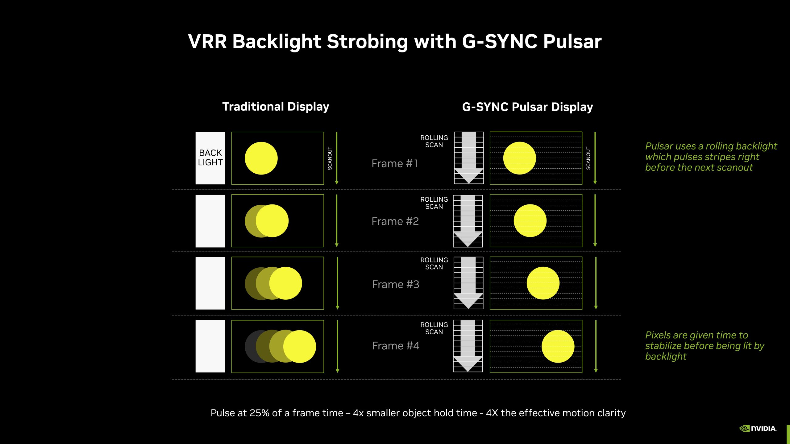 At its most basic level, backlight strobing works by reducing the amount of time each frame is visible. With Pulsar, Nvidia says that the backlight is only pulsed for 25% of the frame time, meaning each image is only briefly illuminated once the pixels have fully settled. In theory, that 1/4 frame visibility translates into 4x lower persistence, and this is how the company claims ‘1000Hz+ effective motion clarity'.