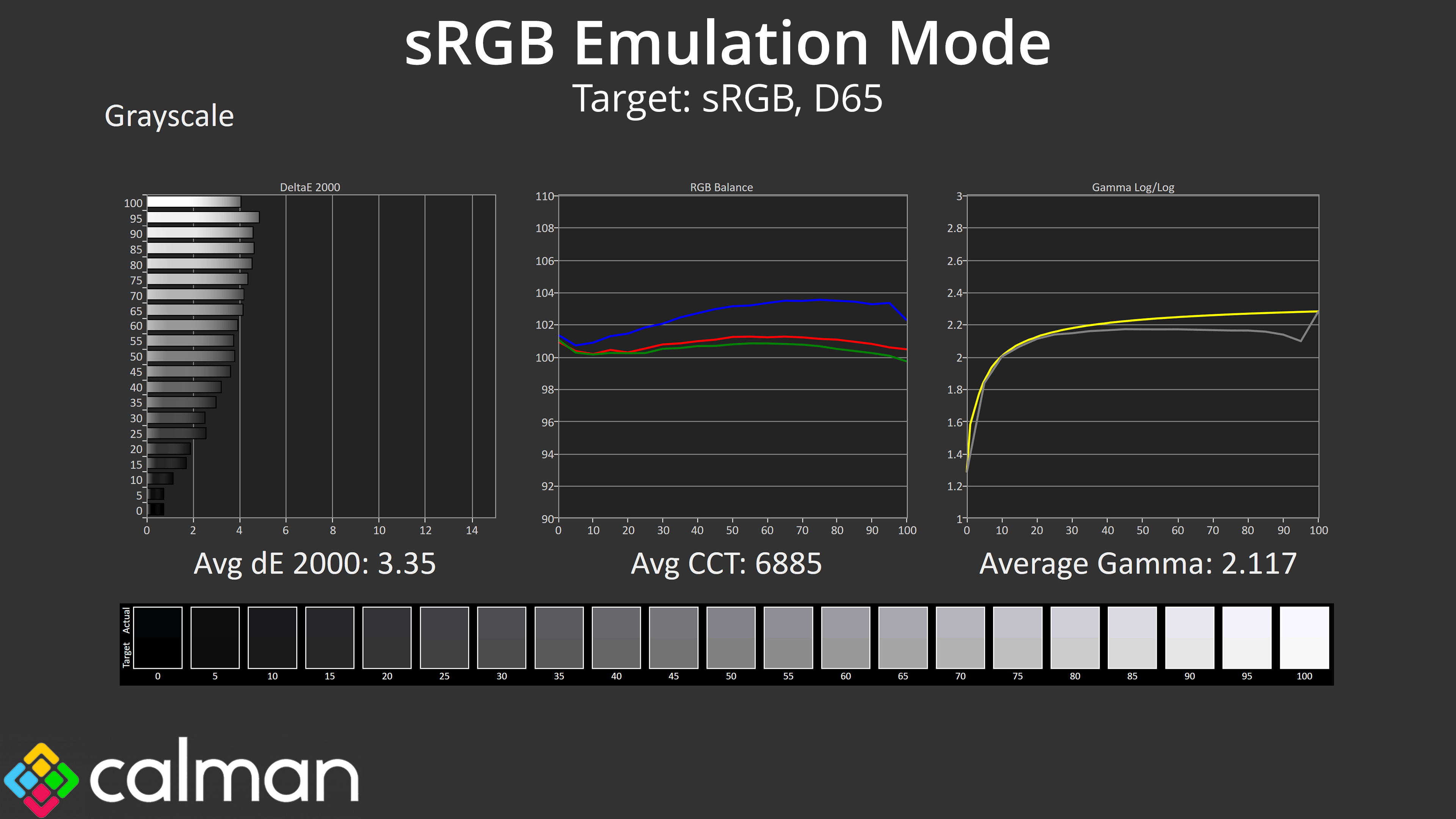 - Greyscale accuracy, measured across 20 shades, with an average colour balance reported.