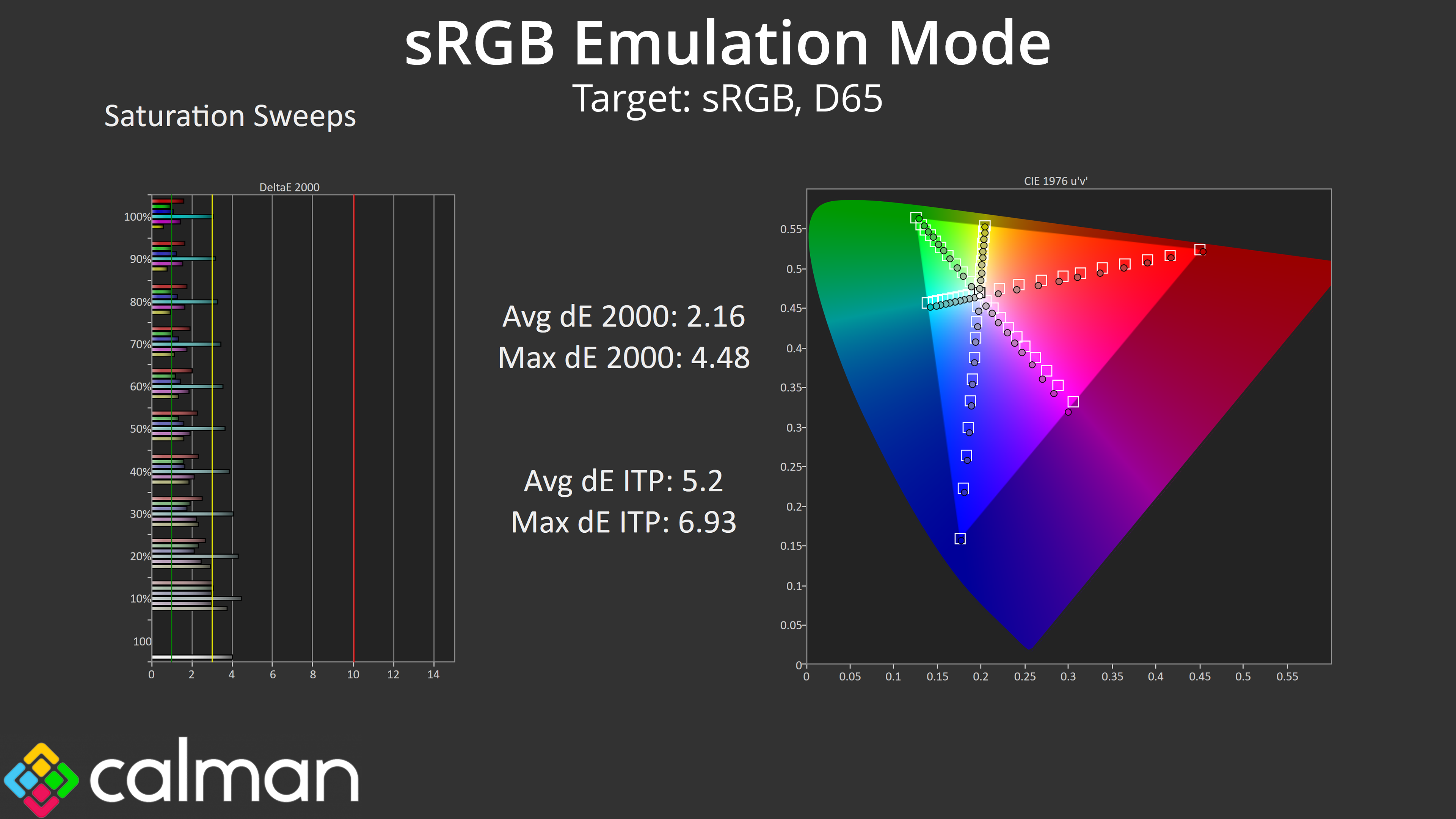 Saturation sweeps do show some oversaturation relative to sRGB as we'd expect, though the inaccuracy isn't terrible, with an average deltaE 2000 of 2.25.
