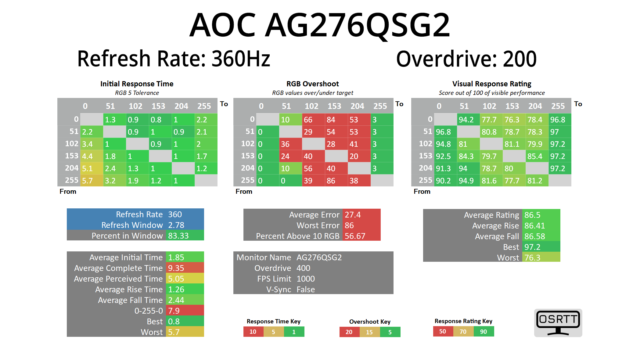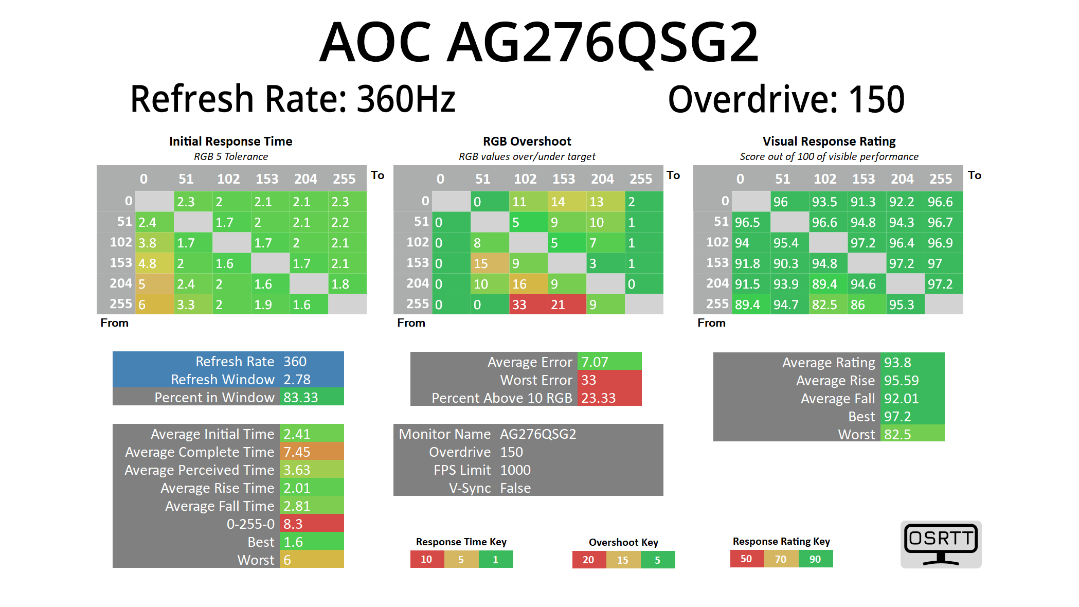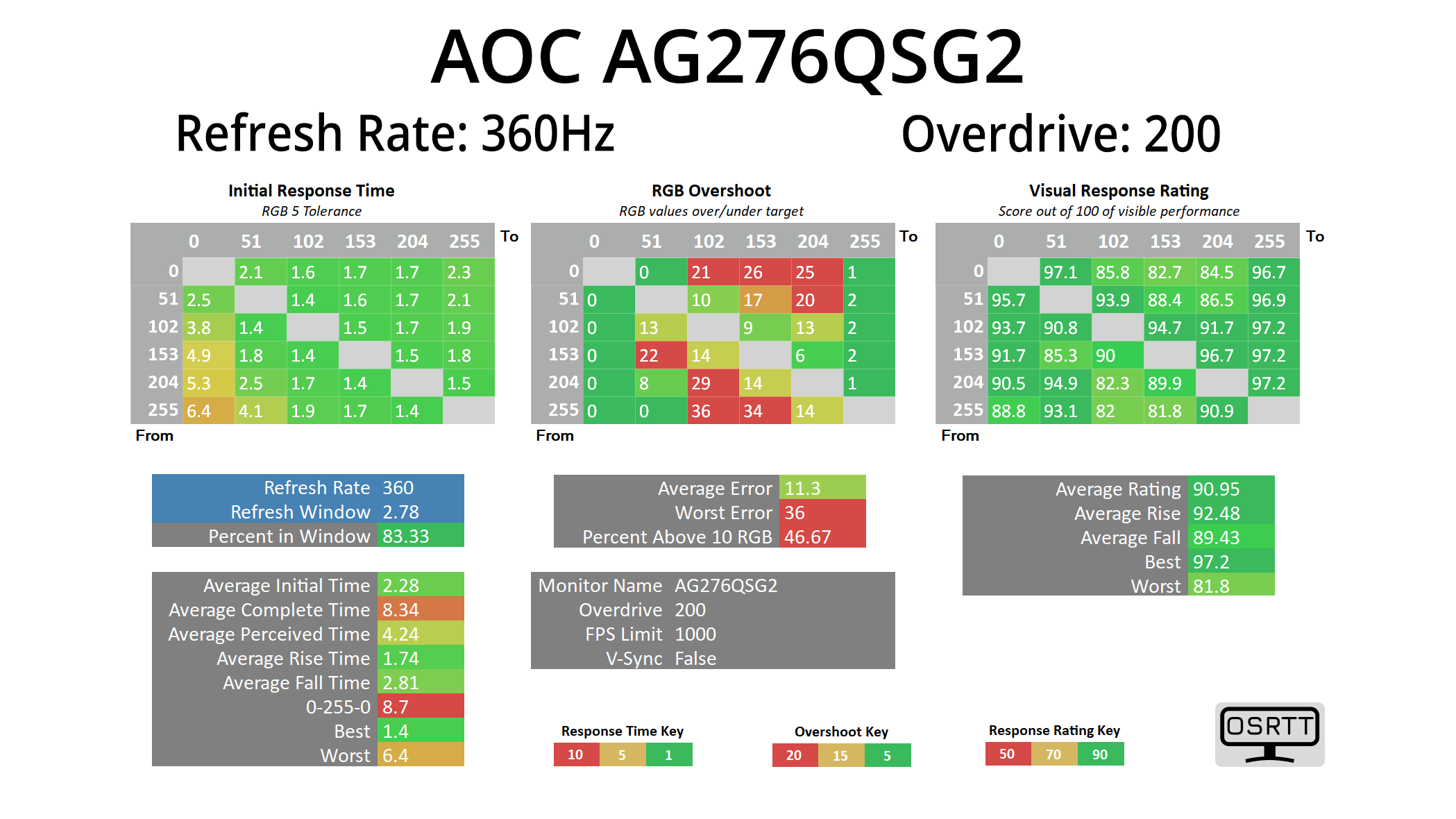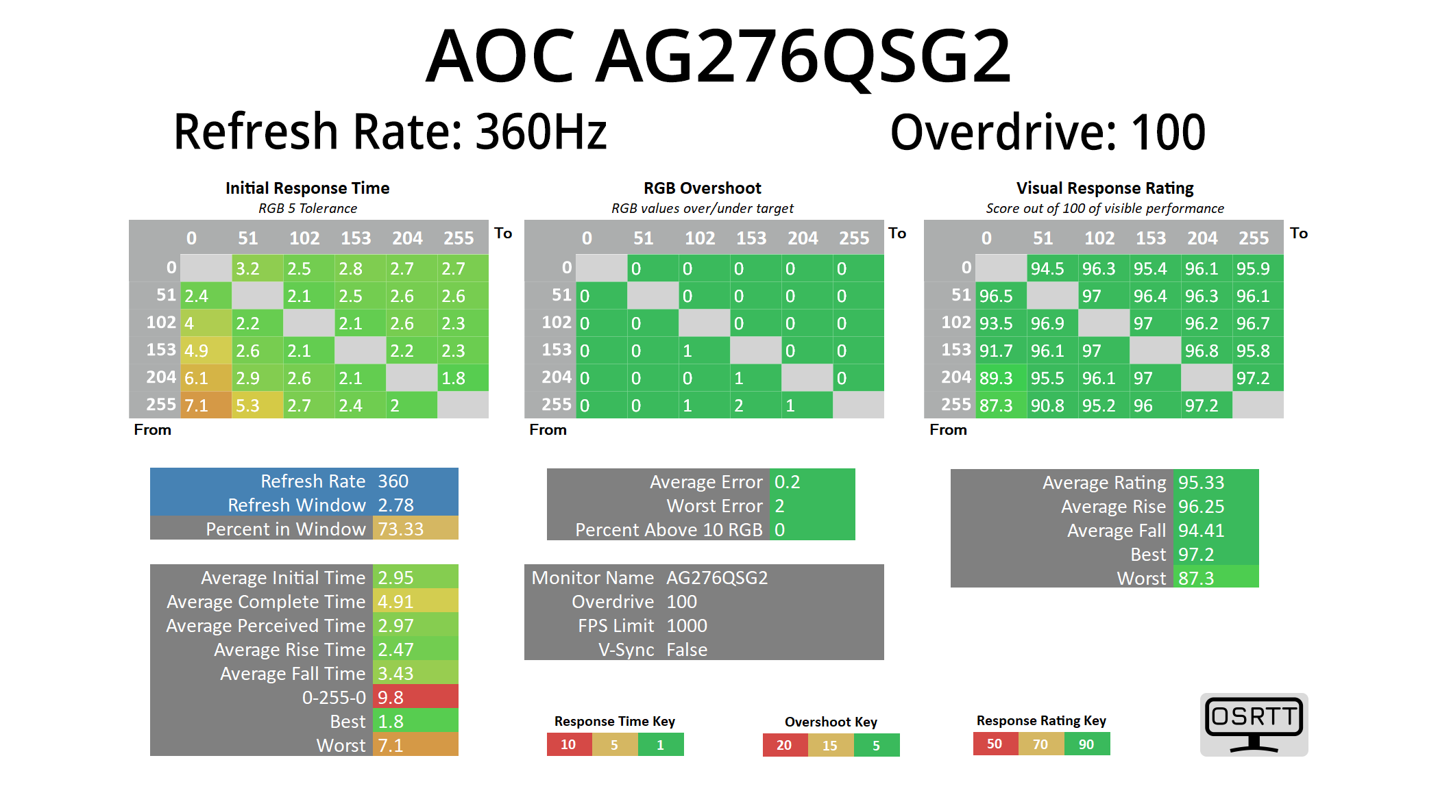 We use the Open Source Response Time Tool (OSRTT), developed by TechTeamGB, for our response time testing. This measures grey-to-grey response times and presents the results in a series of heatmaps, the style of which you may be familiar with from other reviews.