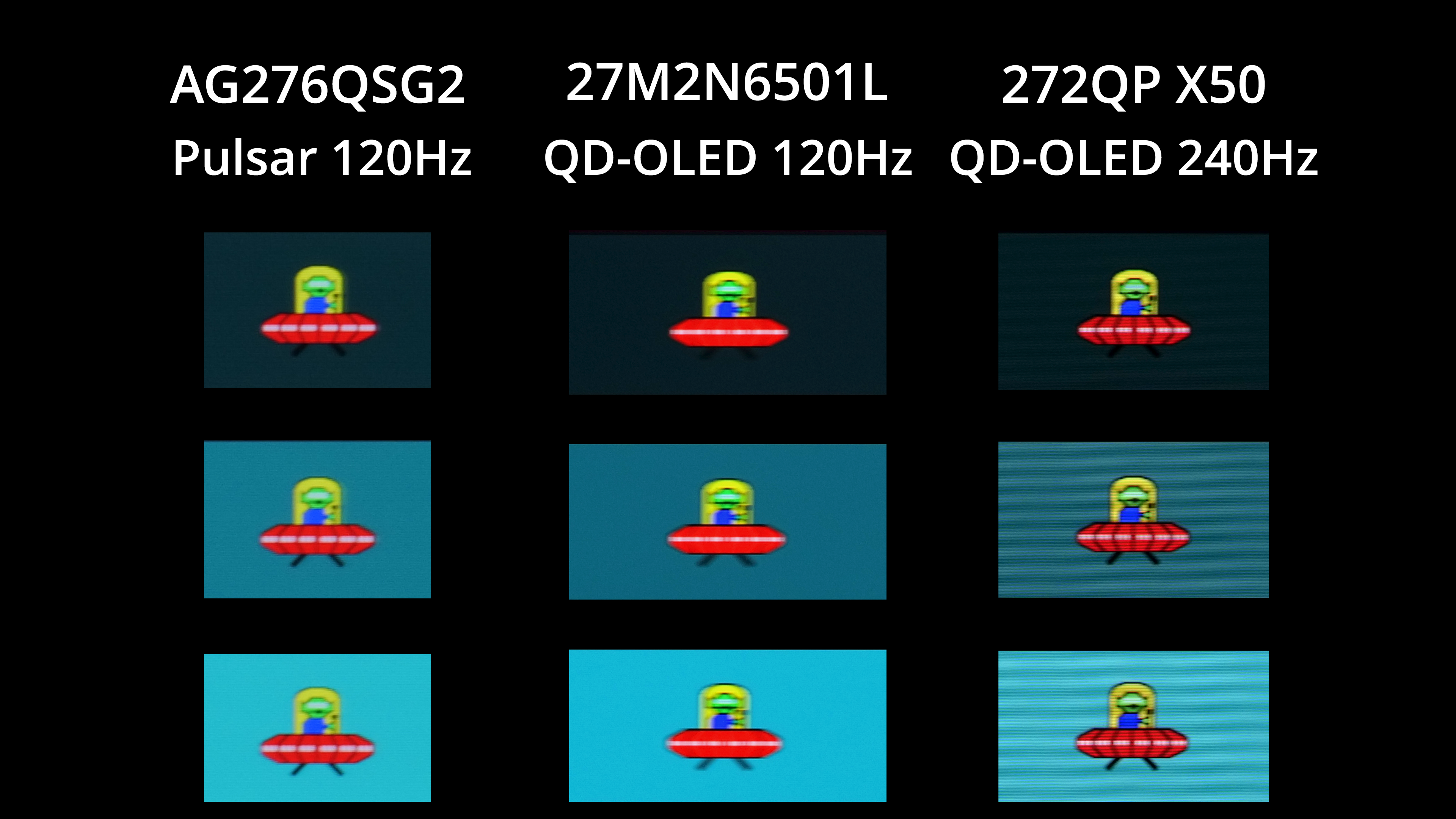The first thing I wanted to do when I saw the Pulsar results was compare them to a fast OLED screen. I don't unfortunately have test results for OLED at 720Hz, but a 500Hz panel like MSI's 272QP X50 still shows exceptional motion clarity. Pulsar on the AG276QSG2, I think, is even better, with greater clarity around the alien's three eyes, as well as the arm and torso area. It's not a huge difference by any means, but you have to remember this is being achieved at only 360Hz on the Pulsar monitor, whereas the OLED is having to drive an extra 140fps on top to reach the motion clarity we can see there.