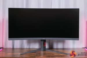 The built-in stand also offers a good variety of ergonomic adjustments. We find up to 130mm height adjustment, 20 degrees of swivel both left and right, along with tilt from +20 to +3.5 degrees. Pivot isn’t officially supported but there is a little play in the stand so you can rotate it just a little bit as you can see above. VESA 100×100 mounts are also supported, while you can get an idea of the 1500R curvature from these photos, too.