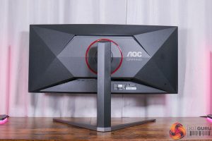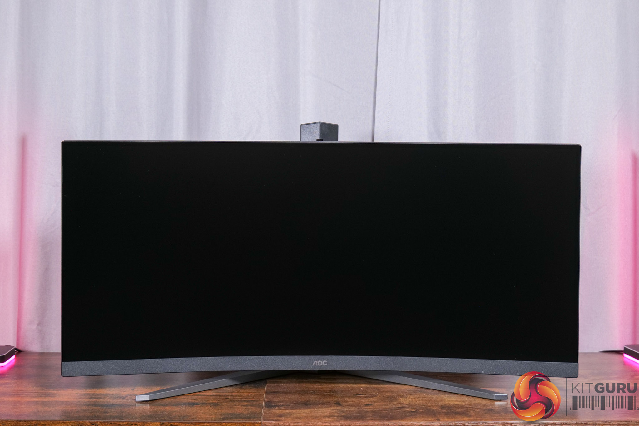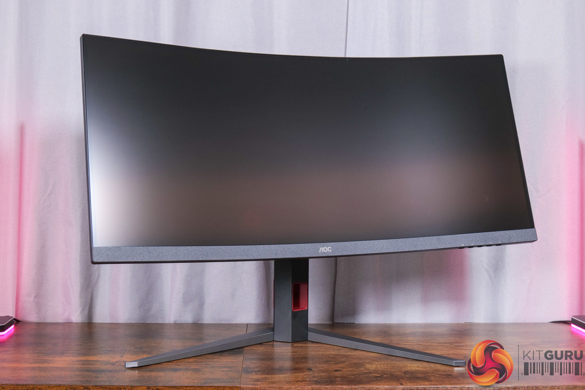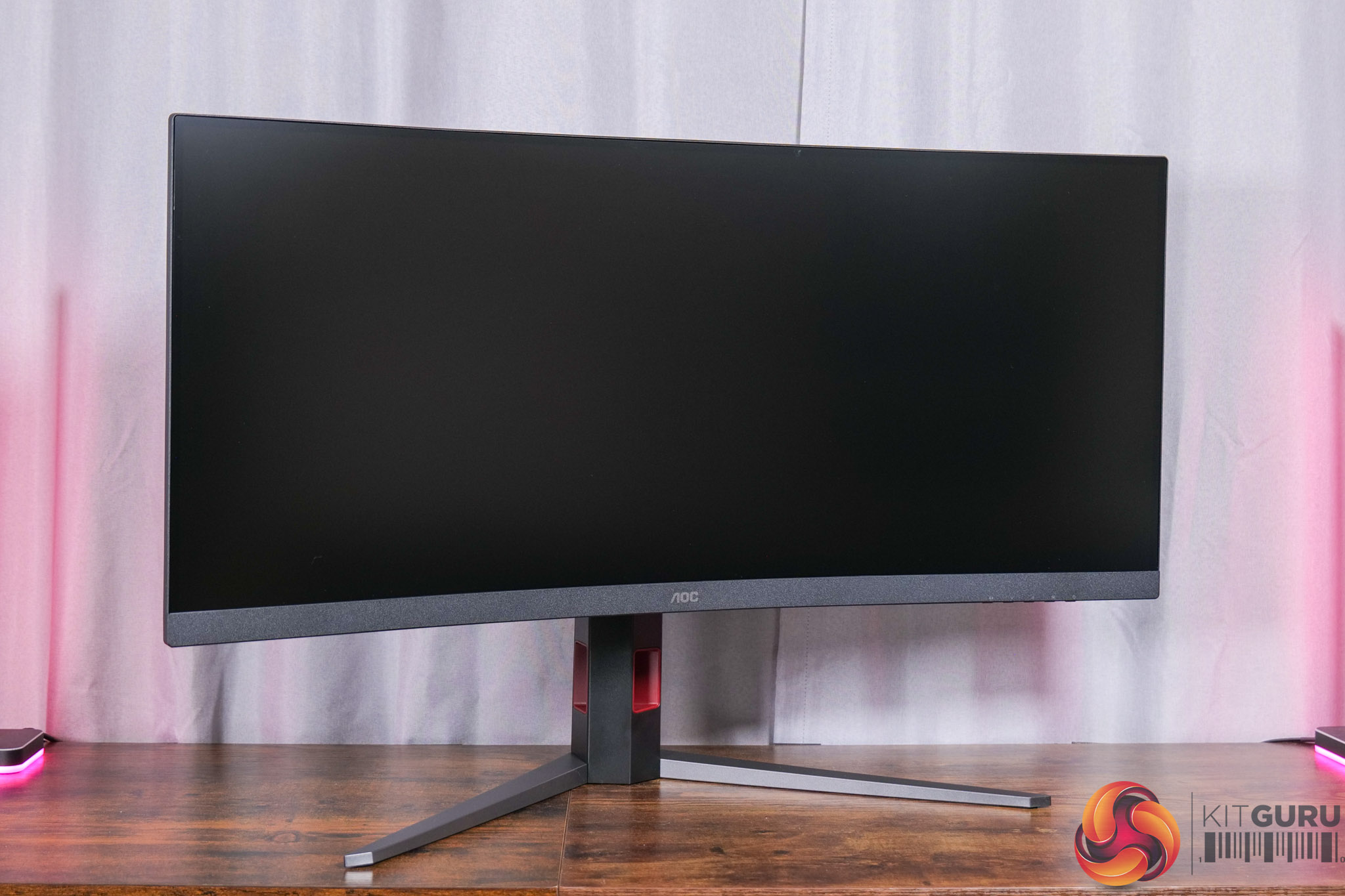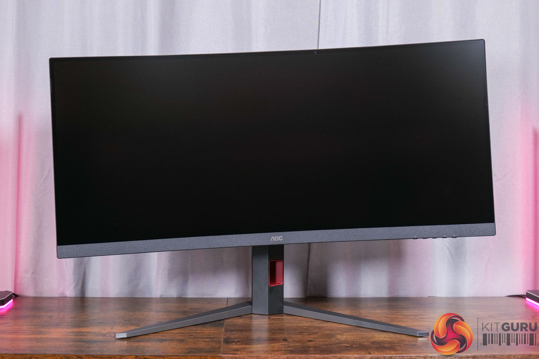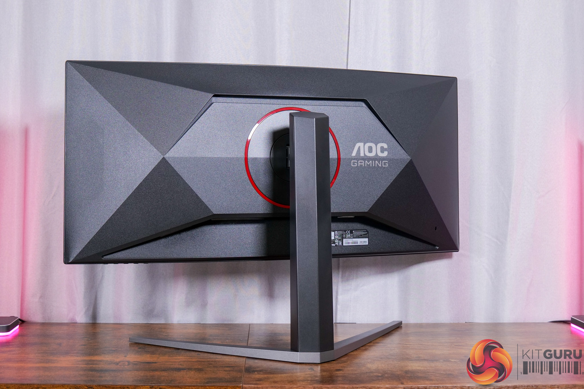 In terms of the design of the monitor, AOC’s G series all have a fairly similar aesthetic and the CU34G4Z is no different. It’s almost entirely matte black, with the angular rear giving it a slightly aggressive gamer aesthetic, but from the front it looks more laid-back. It’s sporting a grey v-shaped foot, and this measures 56cm wide, so it isn’t overly large as ultrawides go.