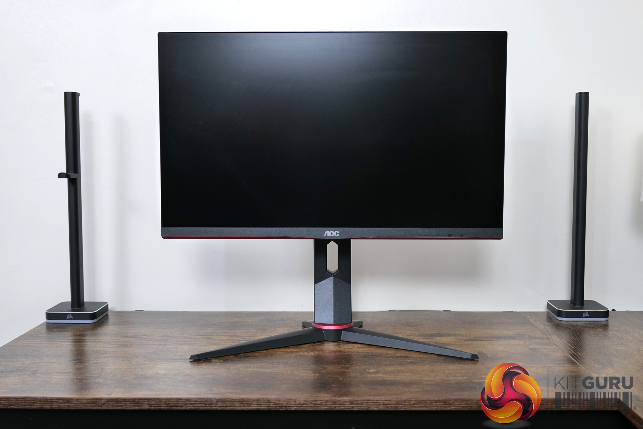 Starting with the design of the Q24G2A, it's nothing we haven't seen before from AOC. In fact, I think if you imagined an archetypal AOC monitor, it's probably something a lot like this. That means a mostly matte black aesthetic, but with visible red accents alongside a wide v-shaped stand. Most of the red is on the back of the screen, apart from one ring around the base of the stand and a thin strip of red underneath the chin of the front panel.