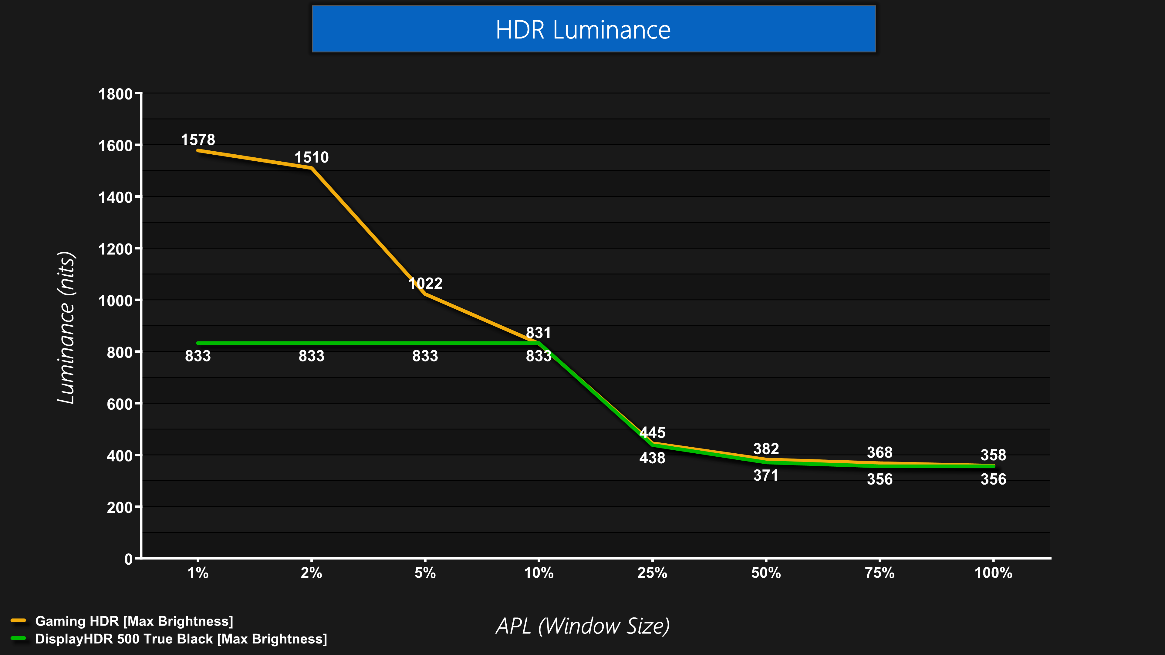 Kicking off with HDR brightness then, the HDR Gaming mode delivers superb results – it peaks at almost 1600 nits, while even the 2% APL holds at 1510 nits, then dropping off as the window size increases.