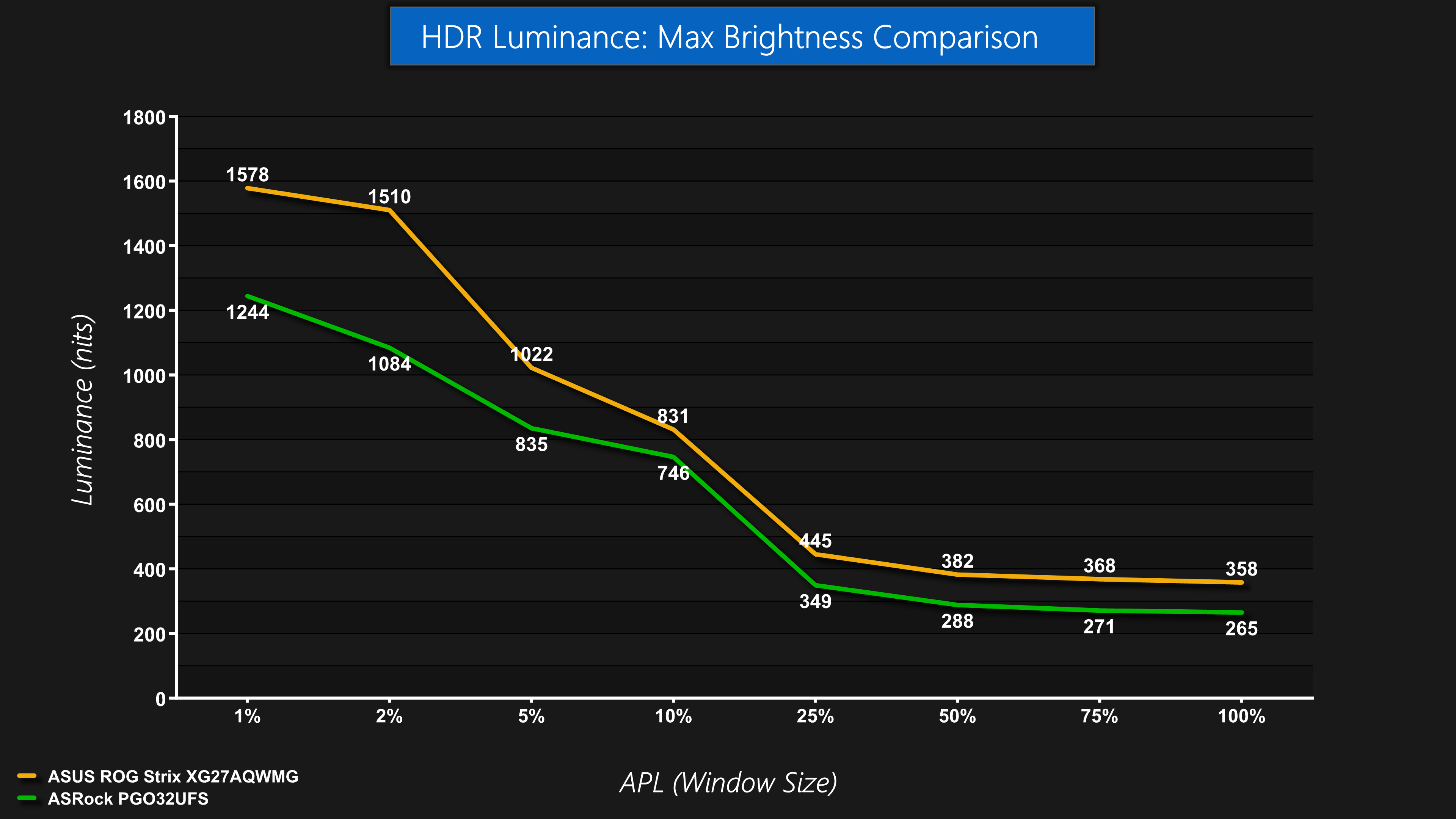 We can again see how much of an improvement this is compared to a prior WOLED panel in the PGO32UFS, with the XG27AQWMG coming in brighter at every APL tested, and by over 300 nits for the 1% APL in particular, so you are getting significantly brighter highlights.