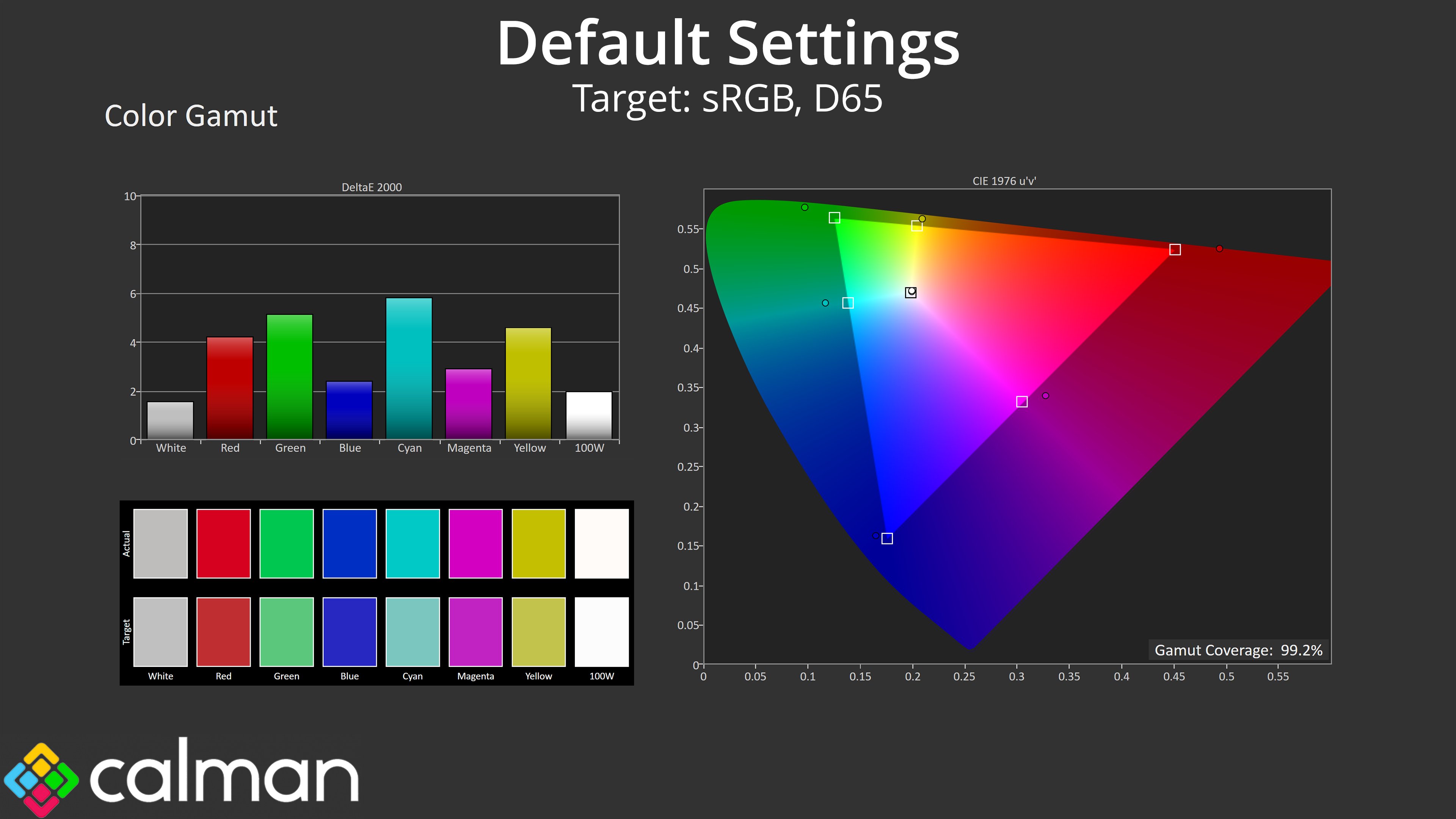 We first run these tests with the display in its out-of-the-box state, with all settings on default. If there is an sRGB emulation option or other useful mode then we may test that too. We then calibrate the screen using the Calman Ultimate software and run the tests again.