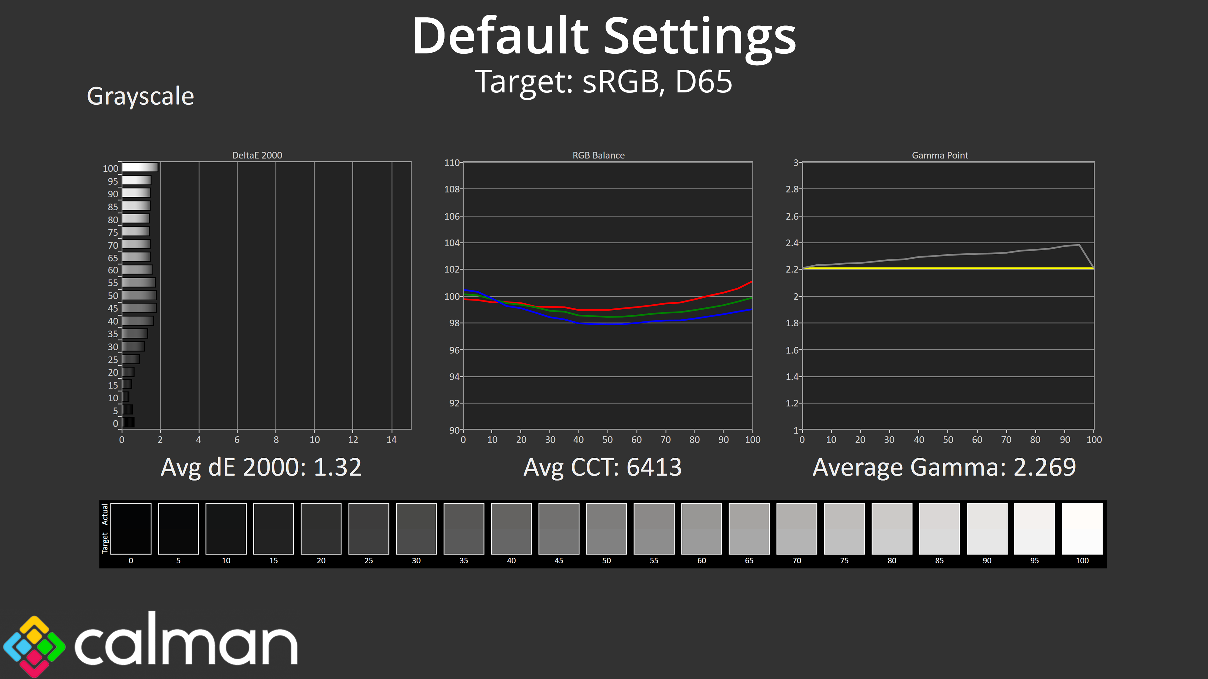 - Greyscale accuracy, measured across 20 shades, with an average colour balance reported.