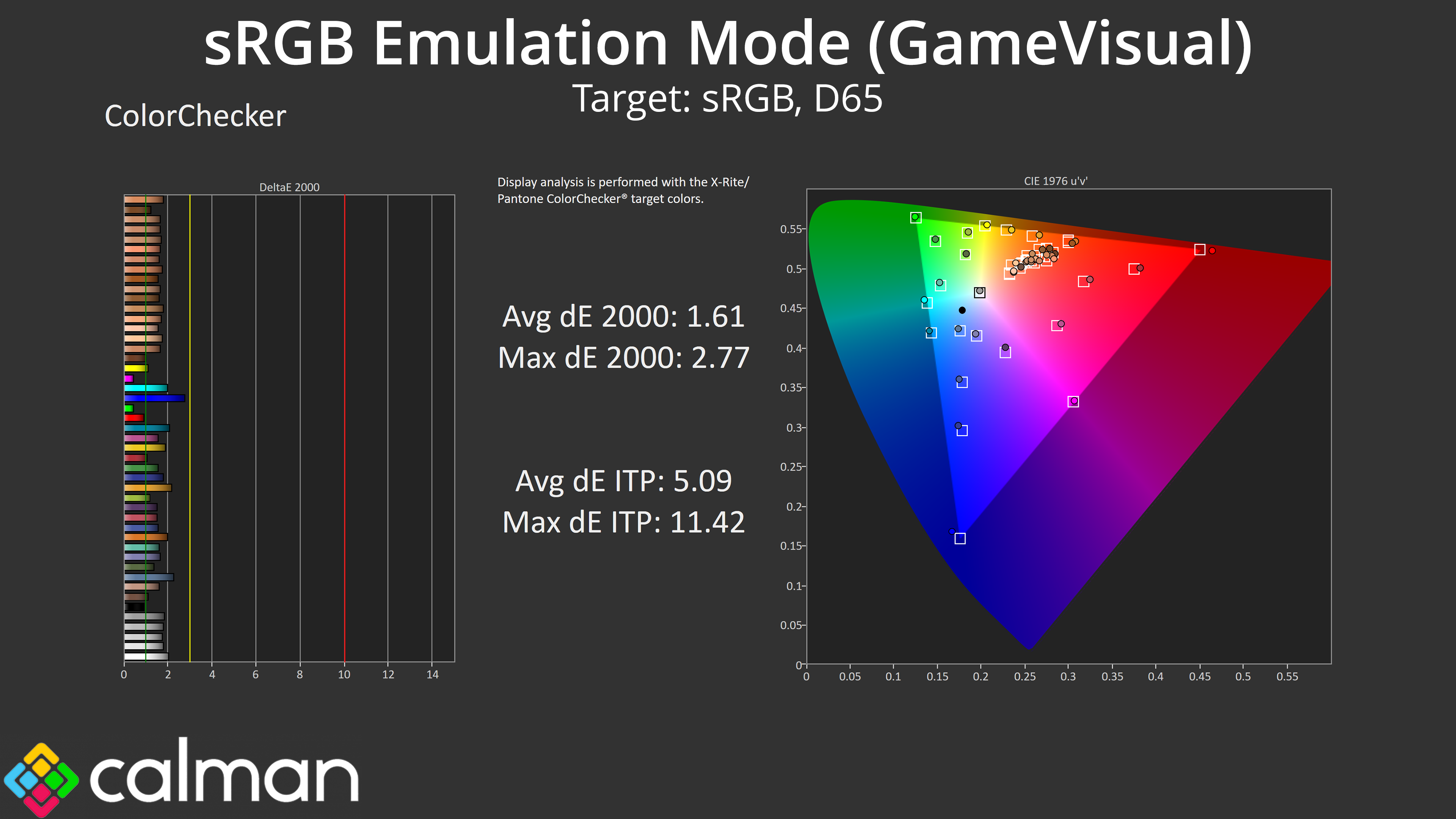 Given the wide gamut on show, we do see a good amount of oversaturation relative to sRGB, though compared against the DCI-P3 space, the average dE 2000 of just 1.37 is very good.