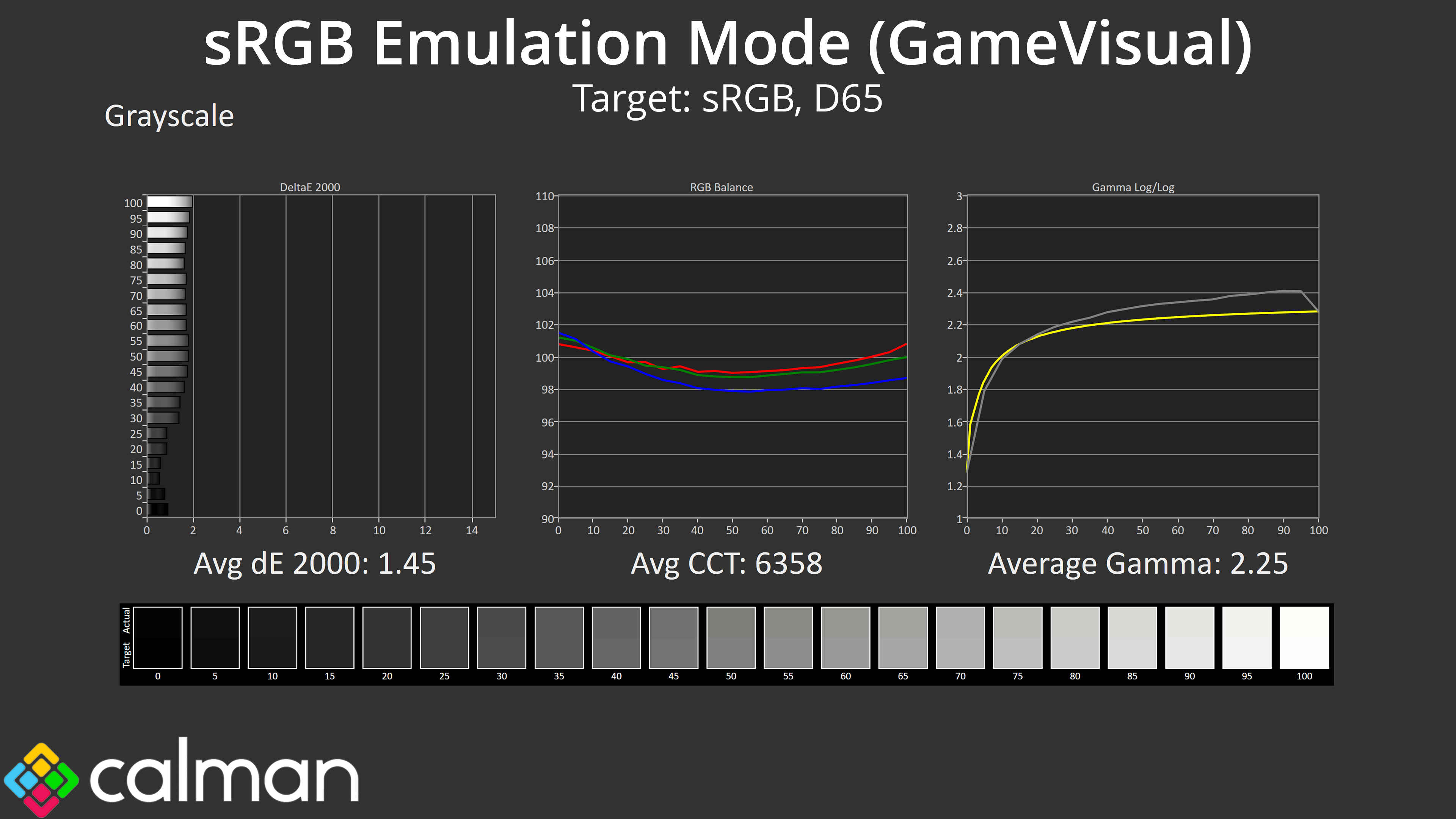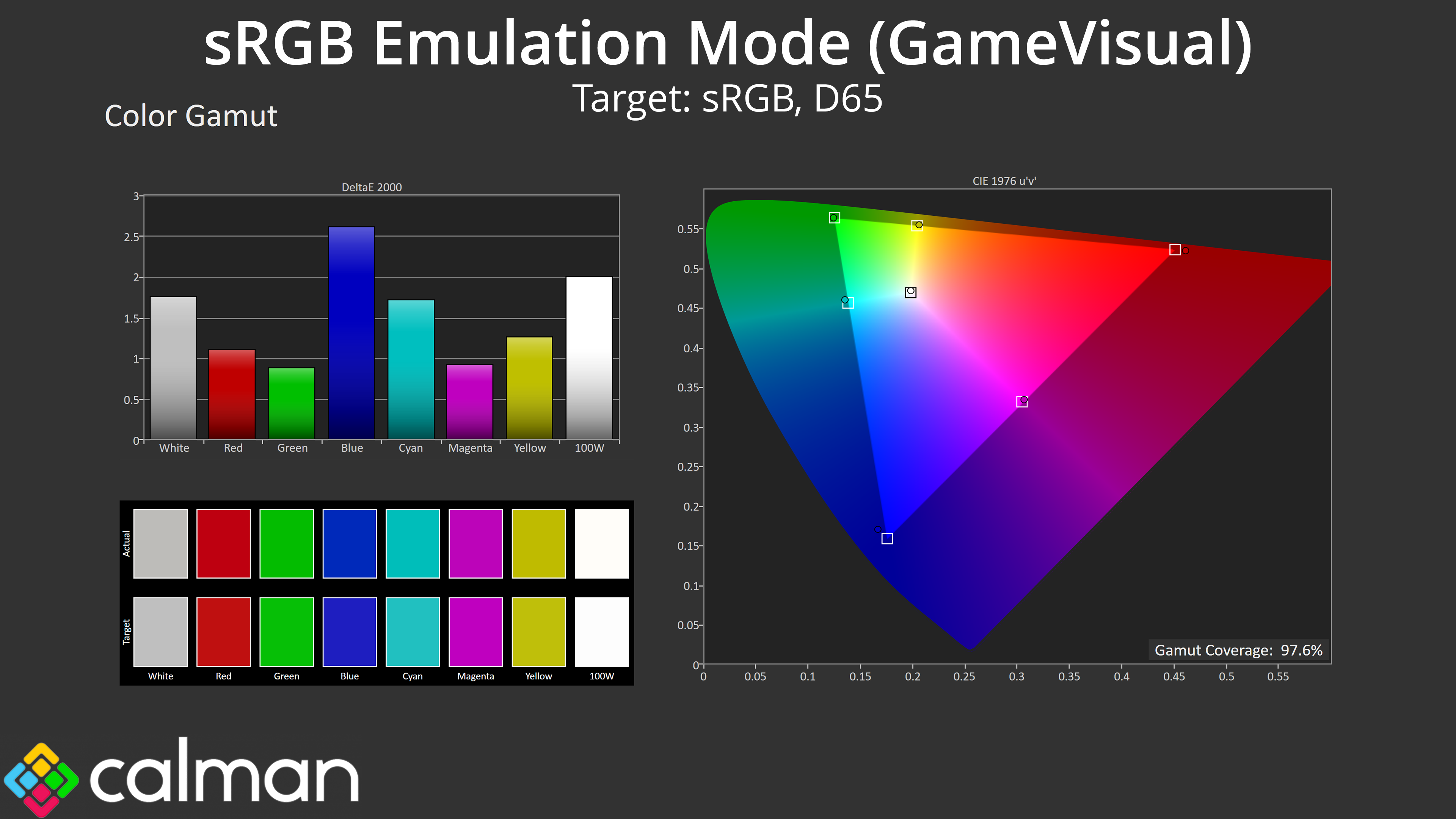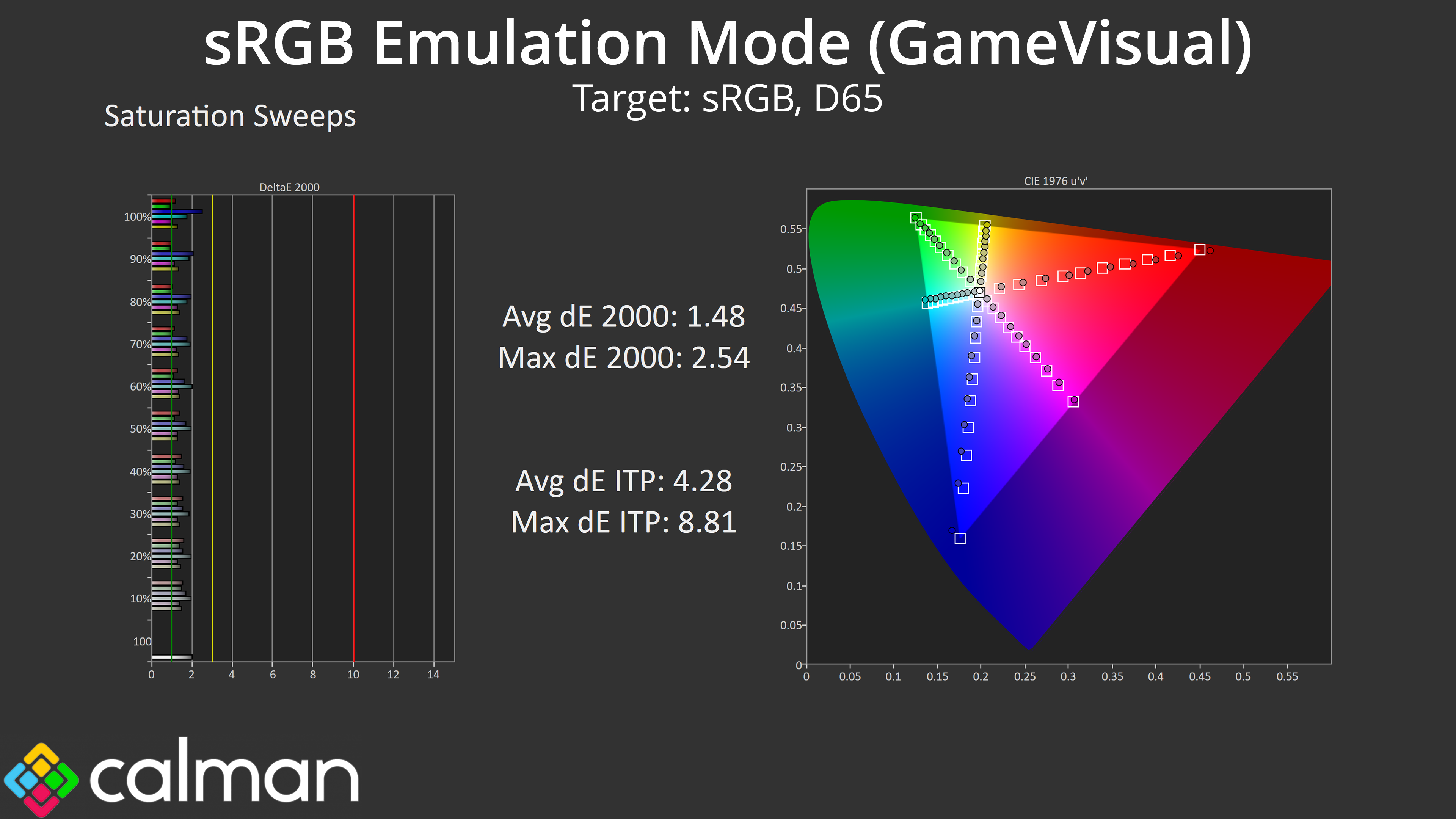 Thankfully there is an sRGB mode included – well, technically there are two! You can enable the sRGB mode via the ‘GameVisual' setting, or you can enable the sRGB space from within the ‘Colour Space' setting. I’m not quite sure why there are two options but I found that using the GameVisual setting gives the most accurate results, clamping the gamut fairly well and keeping an accurate greyscale. Both the saturation and colour accuracy average dE 2000 results also hover between 1.5-1.6, so that's a noticeable improvement over the default results and it's well worth using if you want to reduce oversaturation.