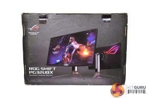 The ASUS ROG Swift PG32UQX ships in a black box, with a couple of images of the screen itself, as well as the ROG branding, visible on the front.
