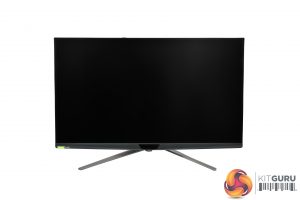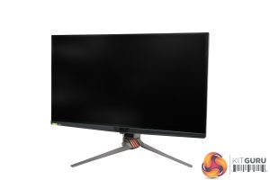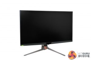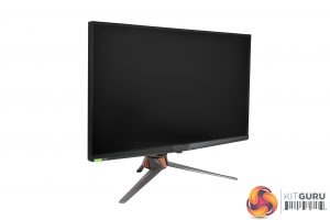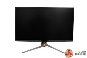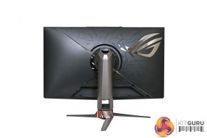 The screen itself looks very similar to previous ROG monitors, with some copper accenting in the base and a three-pronged stand. The back does look more ‘gamer-y' than the front though, with a large ROG logo – which is an RGB zone – as well as a patterned plastic panel.