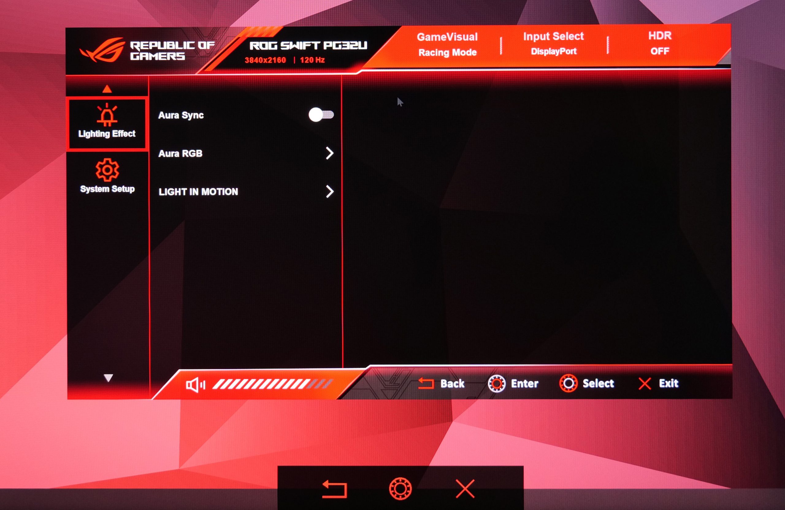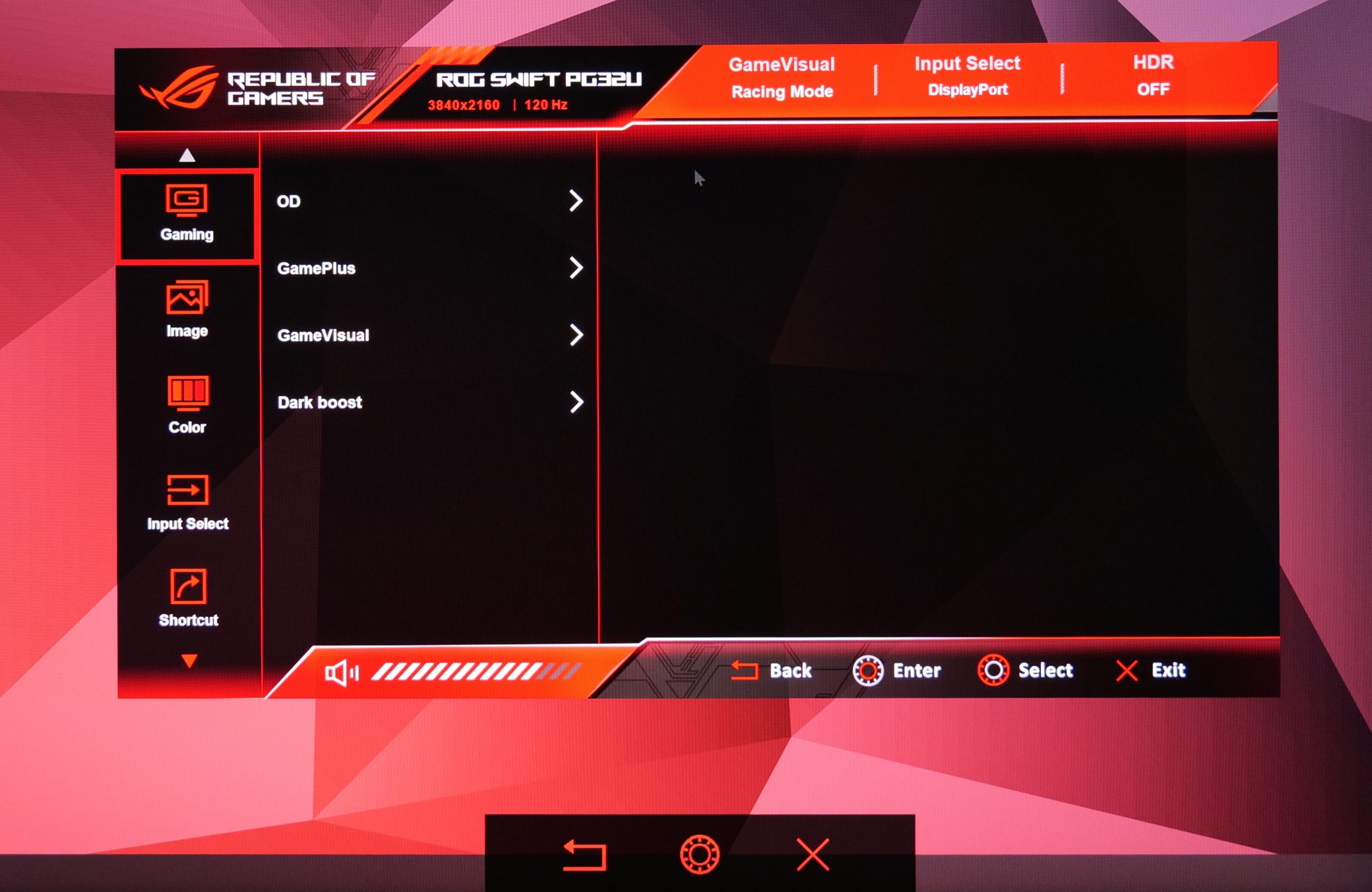 The PG32UQX uses a fairly unique way of navigating the OSD – a dial. The dial itself also houses a clickable button, and it is also flanked by another button on either side, and honestly it works very well – I'd argue it's better than a joystick as it's easier to move through a long list of settings.
