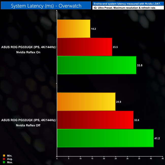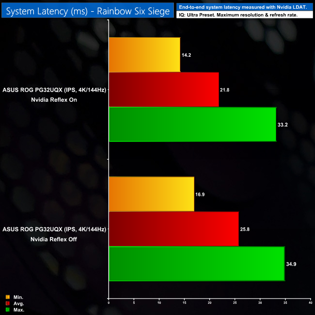 We test two games to measure system latency – Overwatch and Rainbow Six Siege. The PG32UQX is the first monitor we have tested with LDAT so we currently have no comparison data, but we will add to these charts as we review more screens.