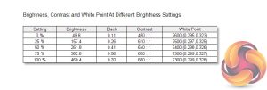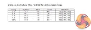 - A monitor’s contrast ratio at various brightness levels in the OSD.