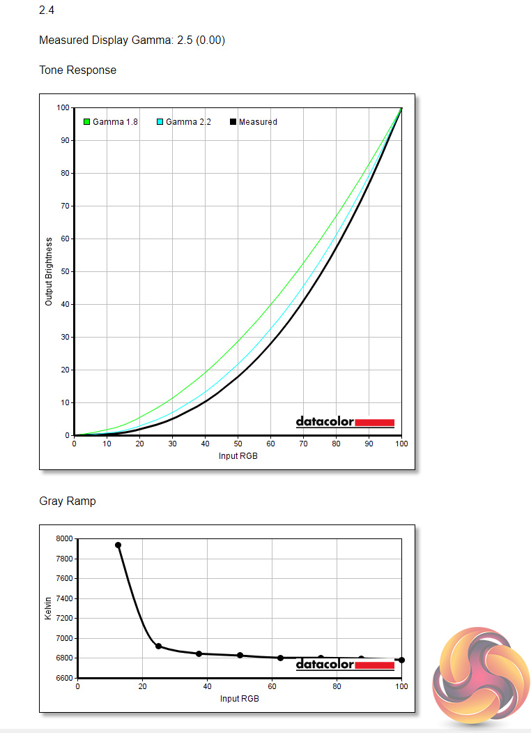 Next up we have gamma settings, with the Xeneon offering three different settings here – 2.0, 2.2 and 2.4. The 2.0 setting did indeed offer a measured gamma value at 2.0, but the 2.2 and 2.4 settings were out by 0.1 – so gamma 2.2 gave an actual result of 2.3, while the 2.4 setting gave a result of 2.5.