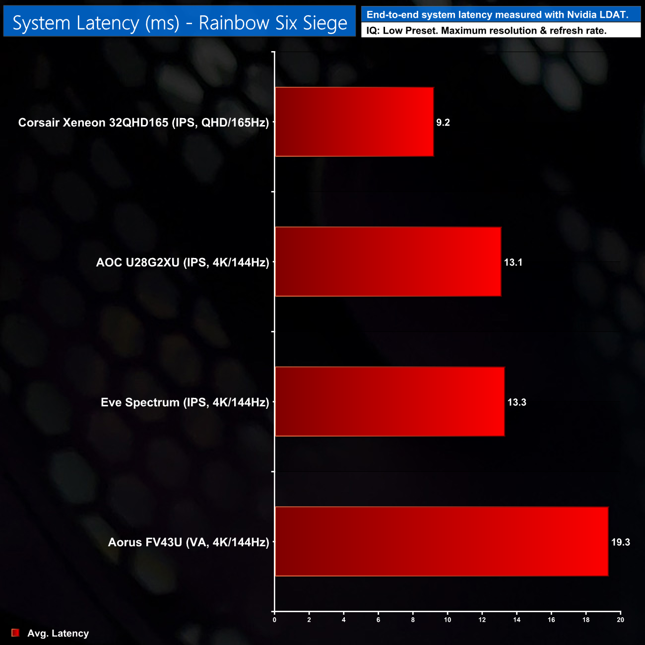 System latency averaged 9.2ms with the Xeneon 32QHD165, about 4ms faster than the like of the AOC U28G2XU and Eve Spectrum. Those are 4K monitors however, so we'd expect lower latency from this QHD panel, but it's good to see that is indeed what was measured.