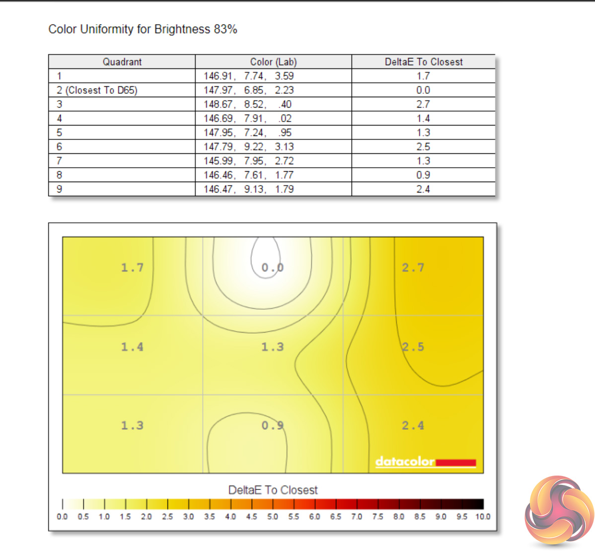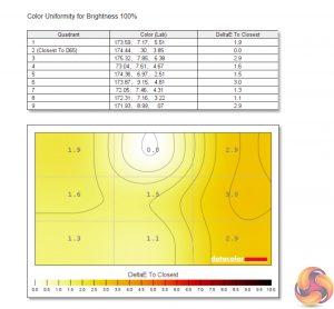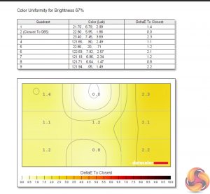 Colour uniformity is very solid, especially at lower brightness levels. There is some deviation down the right-hand side which becomes most evident with 100% brightness, but it's nothing major at all.