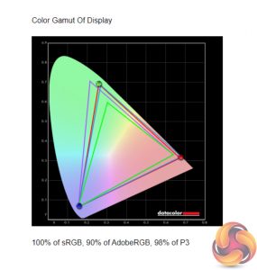 With the Spectrum offering both a DCI-P3 profile and an sRGB profile, we tested both. The DCI-P3 offers 100% sRGB, 90% AdobeRGB and 98% DCI-P3 coverage – right in line with Eve's claims. The sRGB profile naturally hits 100% sRGB coverage, but falls away with the other gamuts.