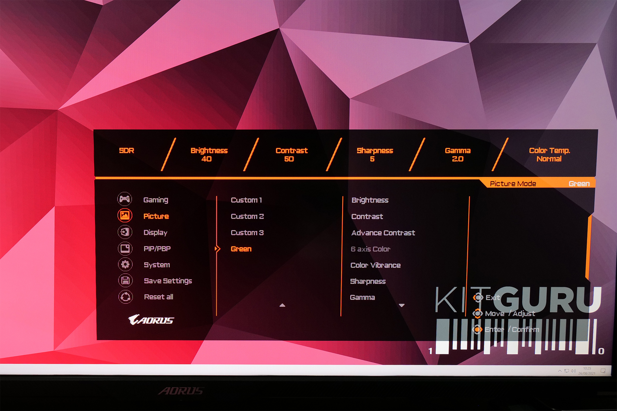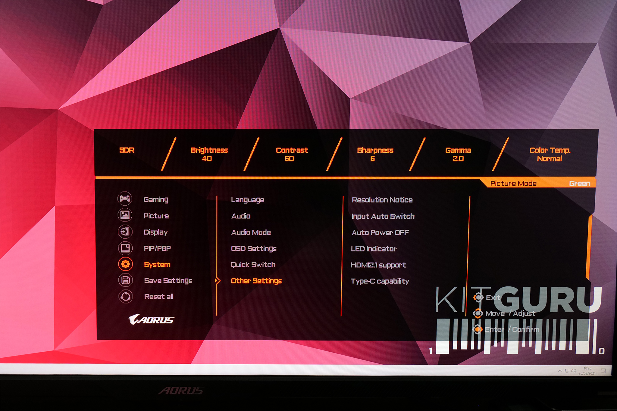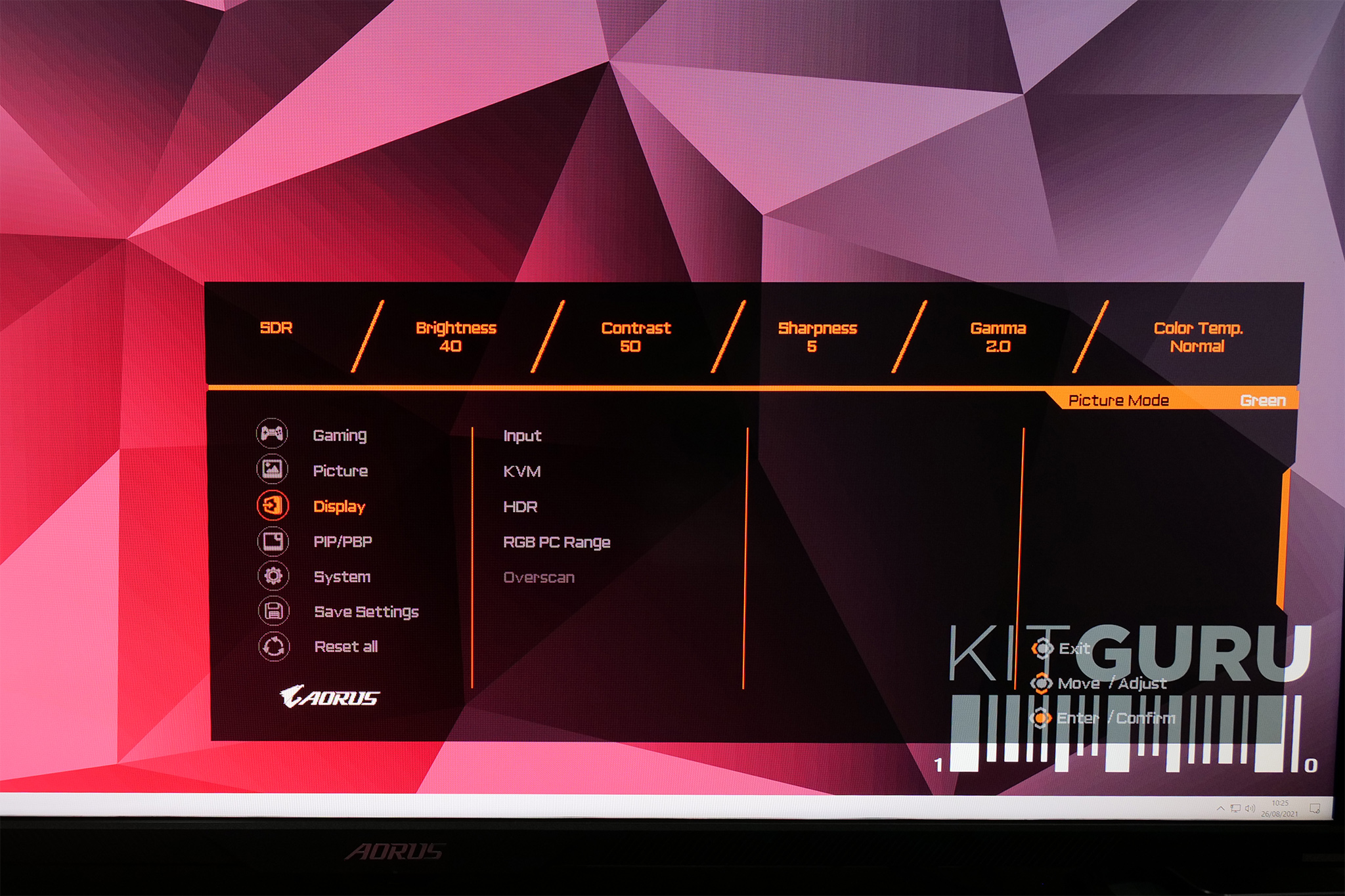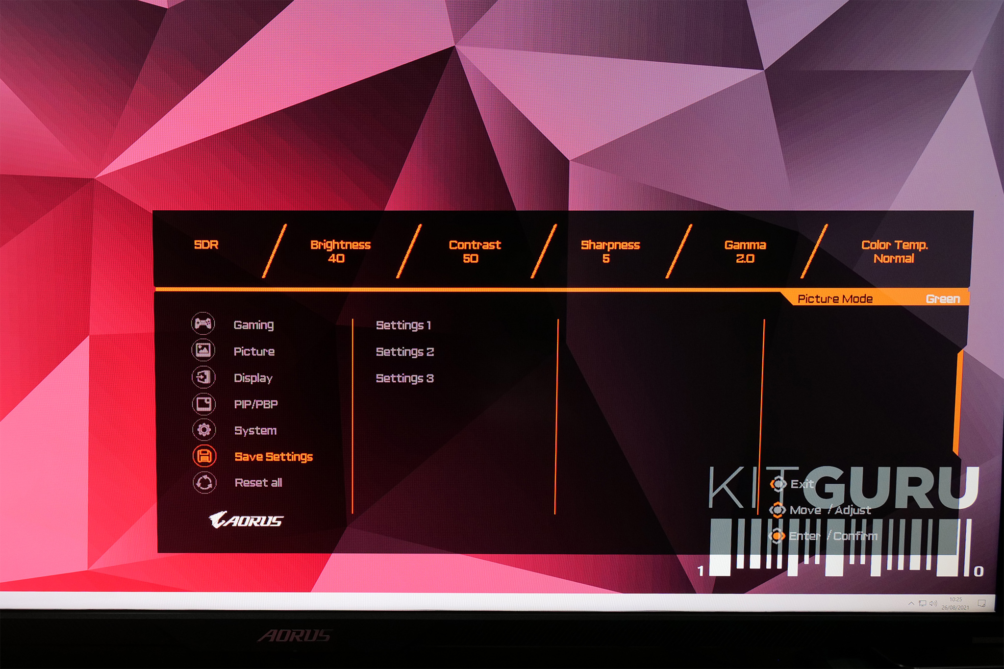 Gigabyte's OSD design is well laid-out, with all the key settings accounted for. Gamer-centric features like an on-screen crosshair and countdown timer are also present, while the ability to save different settings to one of three profiles is actually a very handy idea if you frequently change the input device or want to quickly apply different settings for a different task.