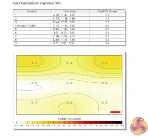 Moving on to brightness uniformity, there's little wrong here. The top and bottom left areas of the screen measure some deviation, at most 10% when brightness is set at 50%, but this isn't much to worry about it.