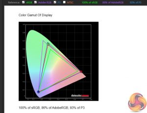 Starting with colour gamut, Gigabyte claims the G32QC is capable of 124% sRGB and 94% DCI-P3 coverage. Our Spyder colorimeter doesn't report values over 100% for the sRGB space, but we do hit that 94% P3 gamut as per Gigabyte's claims, with 86% AdobeRGB coverage as well. So far so good.