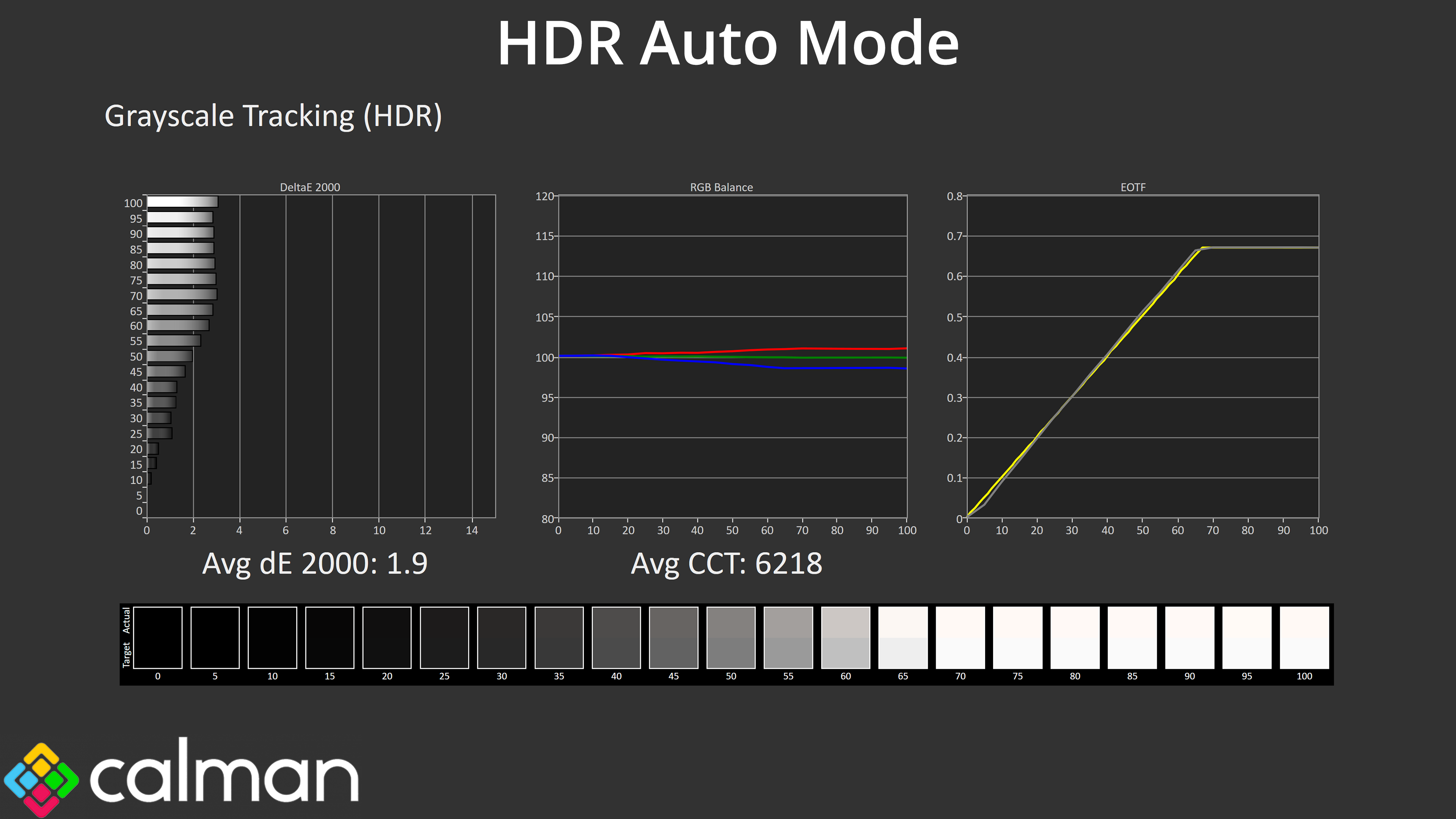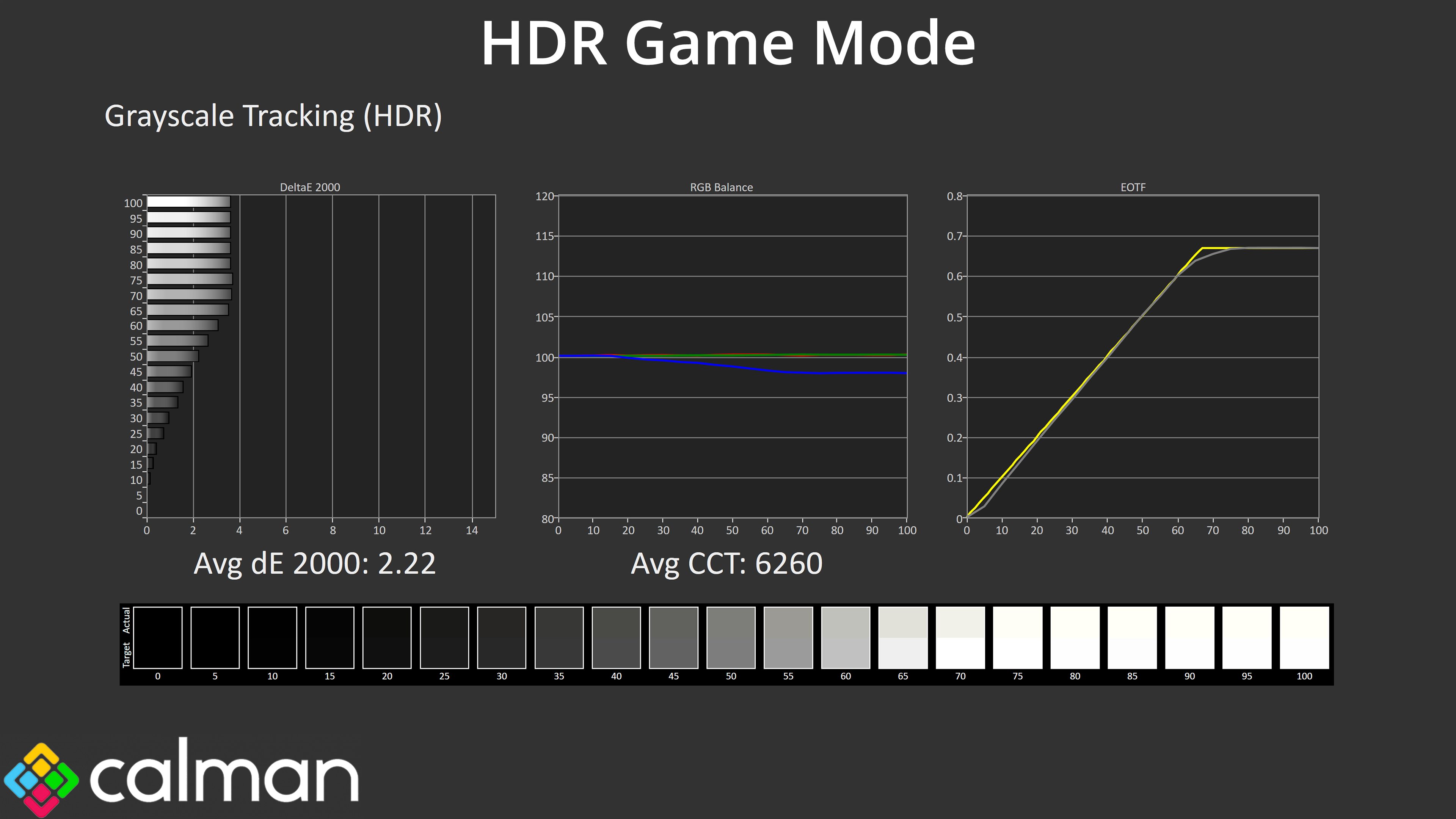 The HDR Auto mode closely matches the HDR Movie mode in terms of EOTF tracking too, both again being very accurate across the board, whereas the HDR Game mode sees the EOTF curve roll off increasingly early as the window size increases, resulting in a darker-than-intended image.