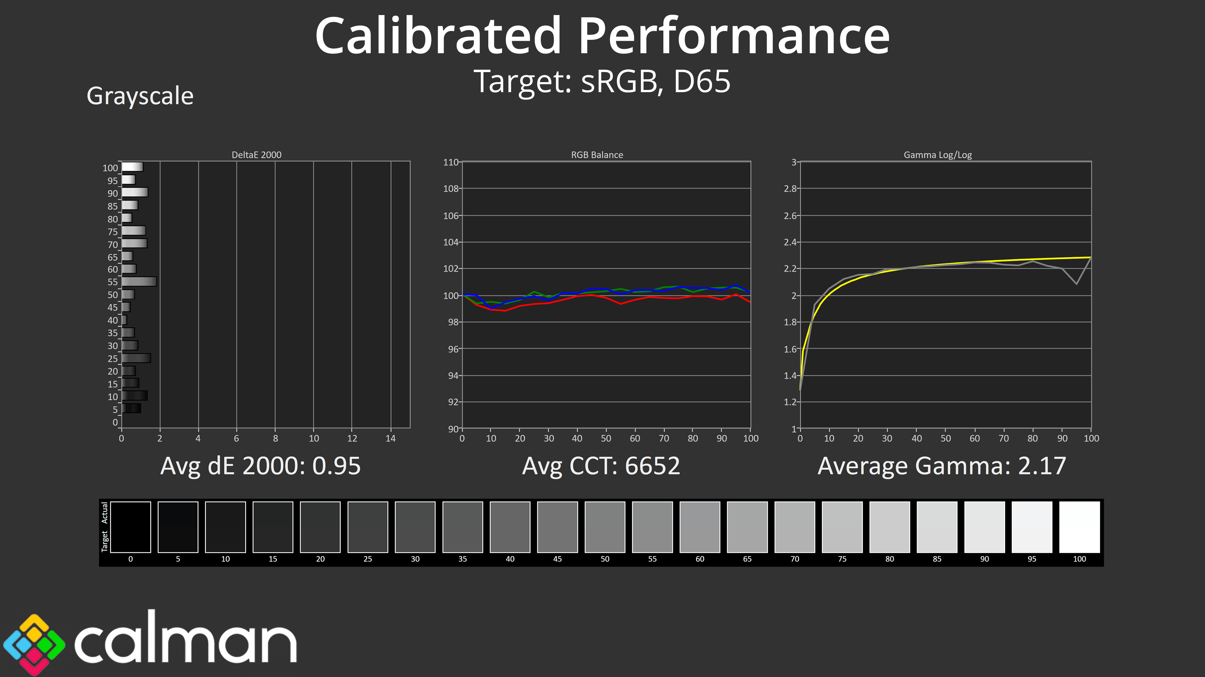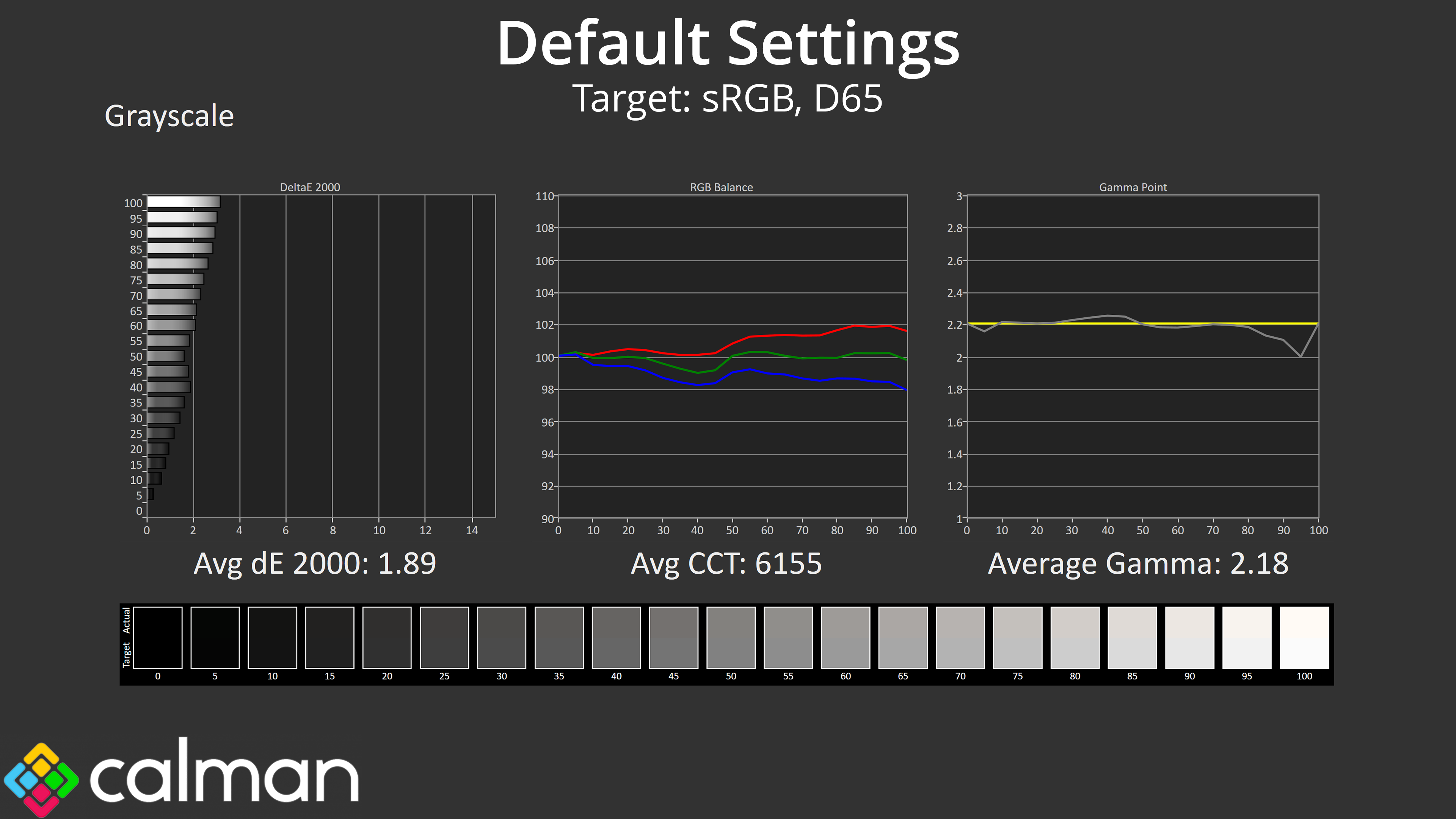 - Greyscale accuracy, measured across 20 shades, with an average colour balance reported.
