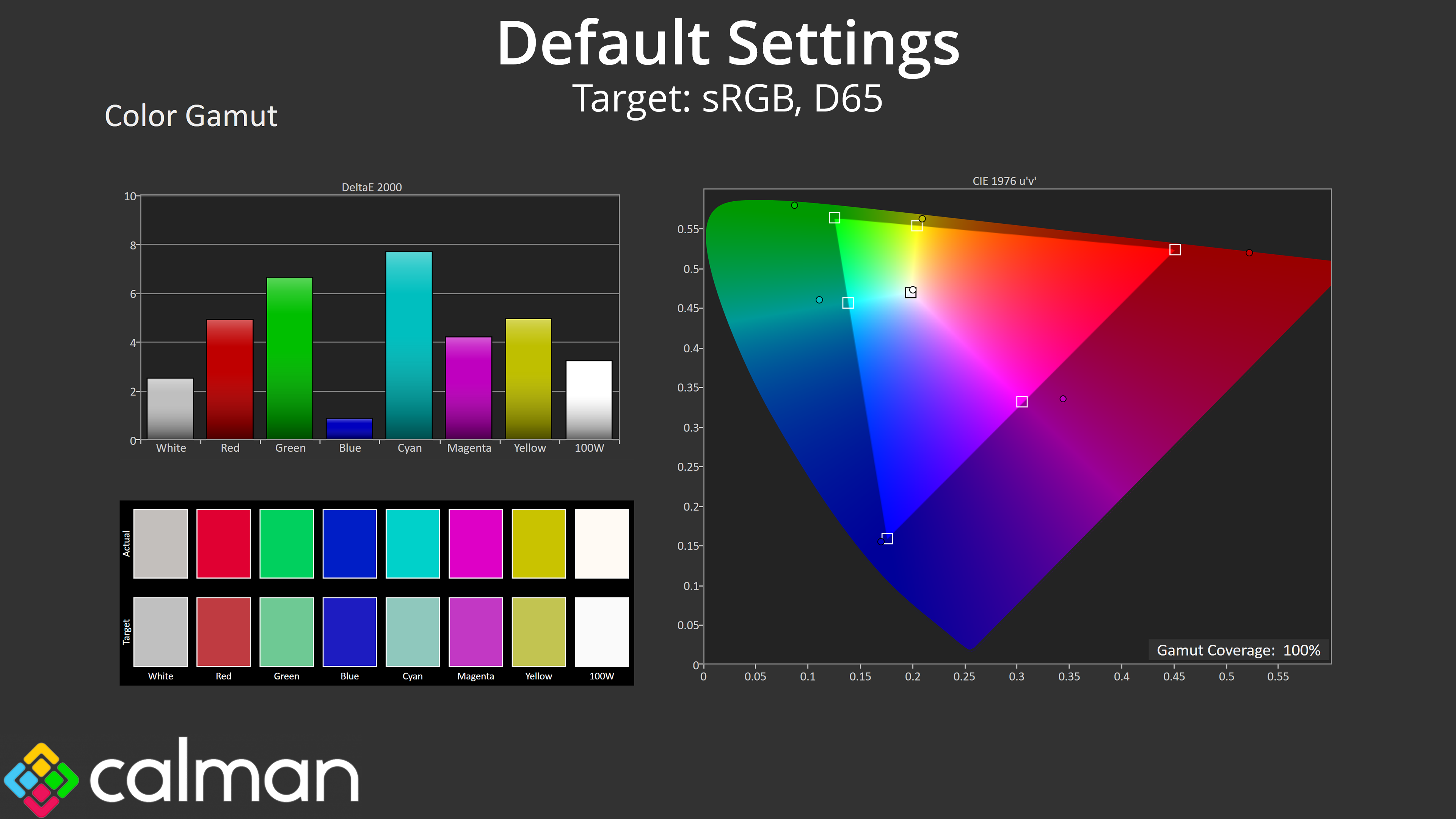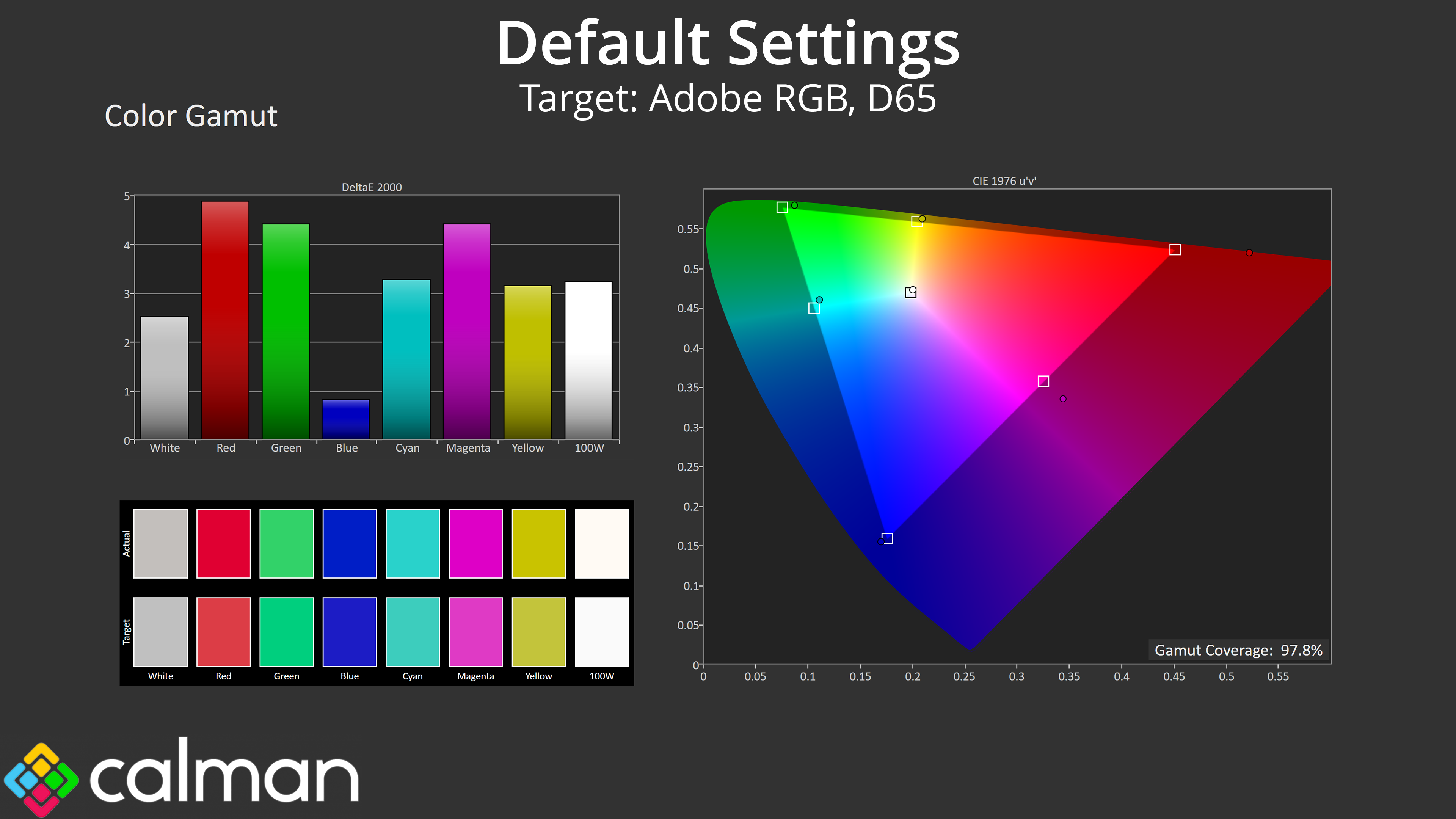 We first run these tests with the display in its out-of-the-box state, with all settings on default. If there is an sRGB emulation option or other useful mode then we may test that too. We then calibrate the screen using the Calman Ultimate software and run the tests again.