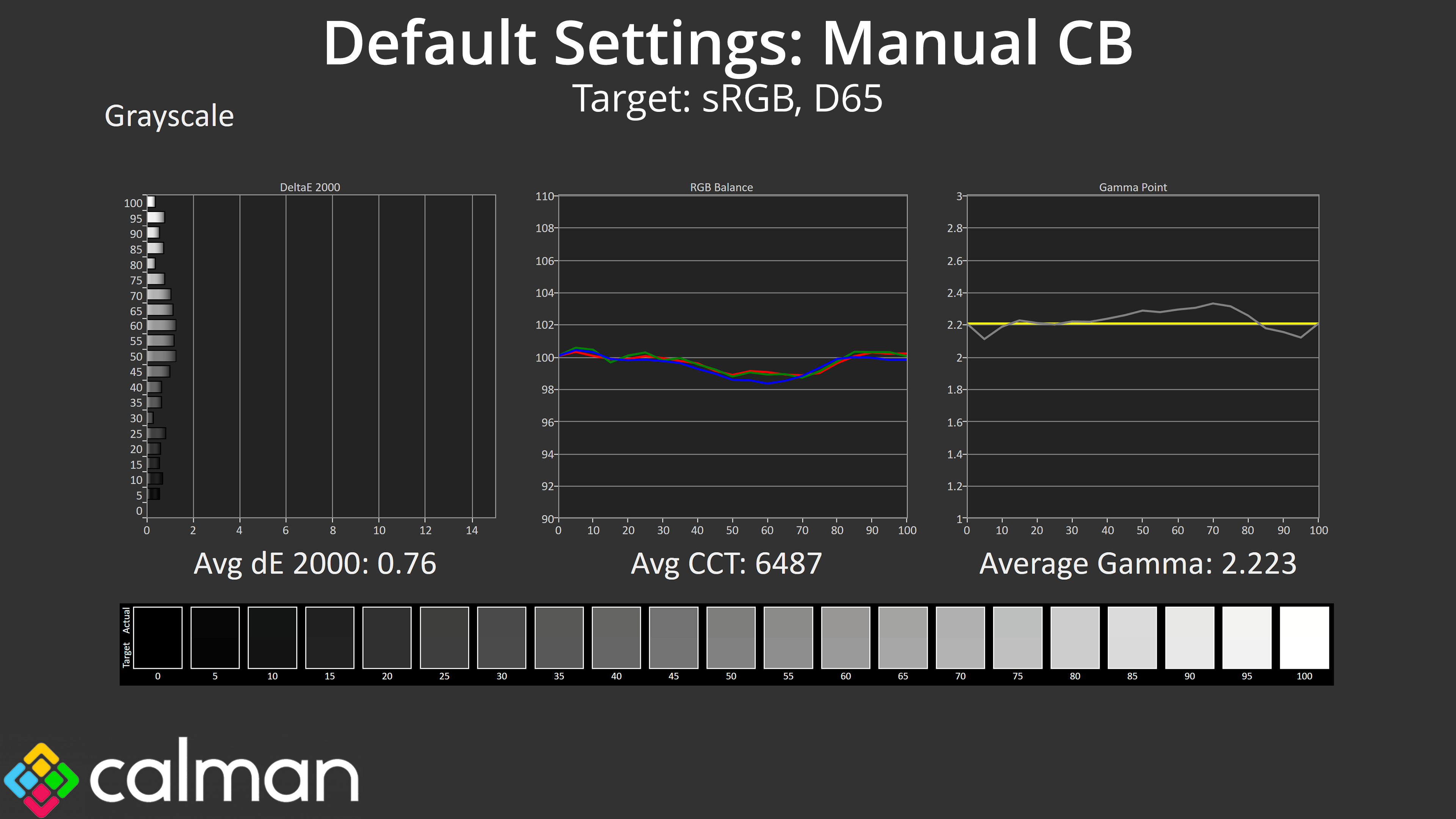 I also tested with a manual colour balance, keeping the Blue channel at 50, but reducing Red to 47 and Green to 48. That delivered an improvement to the average CCT and the average greyscale dE 2000, though it's worth pointing out that enabling manual colour balance also affects brightness for some reason – at 70%, we dropped from 264 nits to 86 nits, so that's a trade-off to keep in mind.