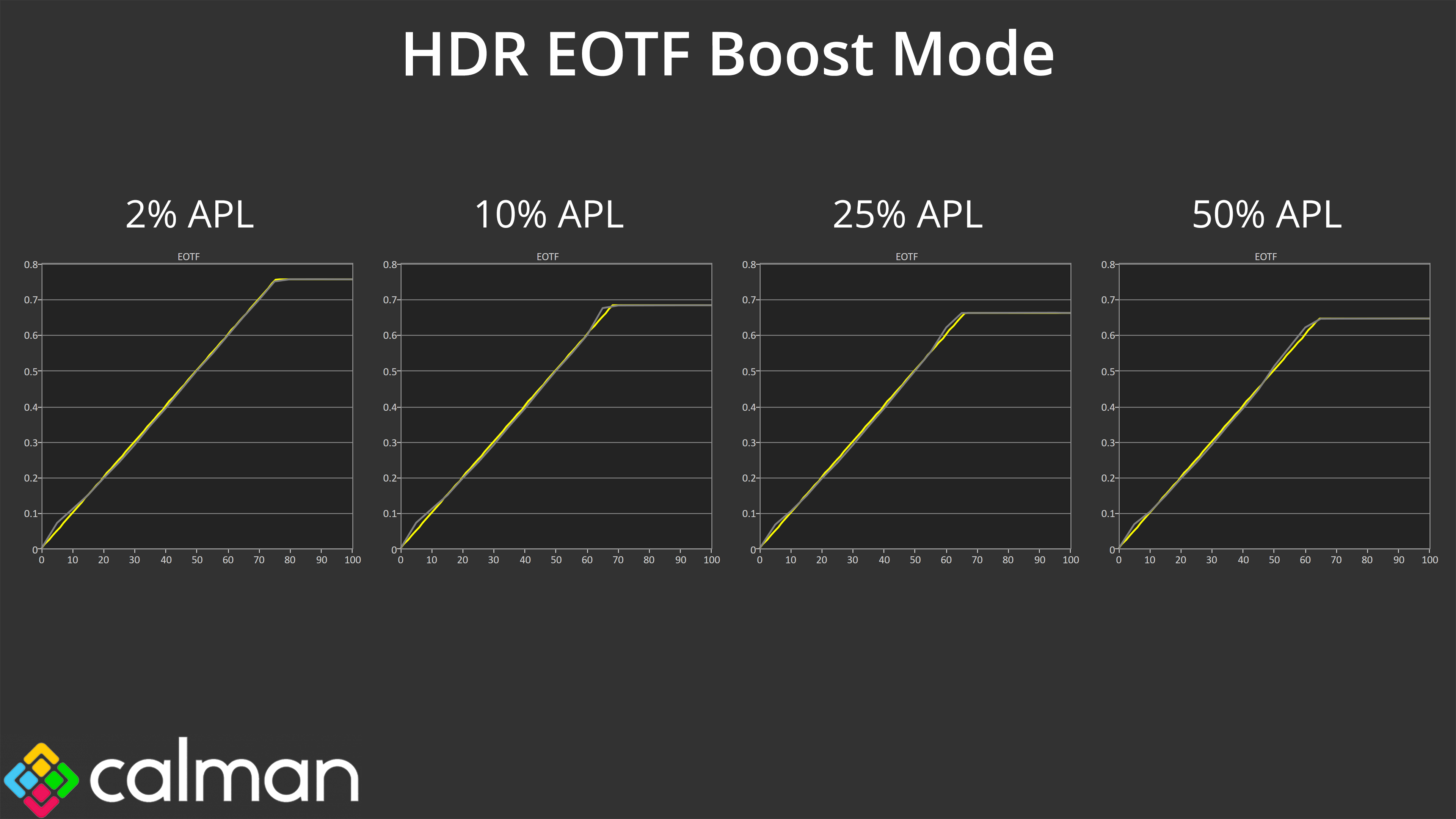What's really interesting though, is the new EOTF Boost mode – designed to fix the issue with the Peak 1000 nits mode, where the EOTF tracking rolls off increasingly early as window size increases – resulting in the image looking overly dark. For these synthetic tests, the EOTF Boost mode looks fantastic, producing a much more accurate EOTF tracking, and generally that translates in the real world.