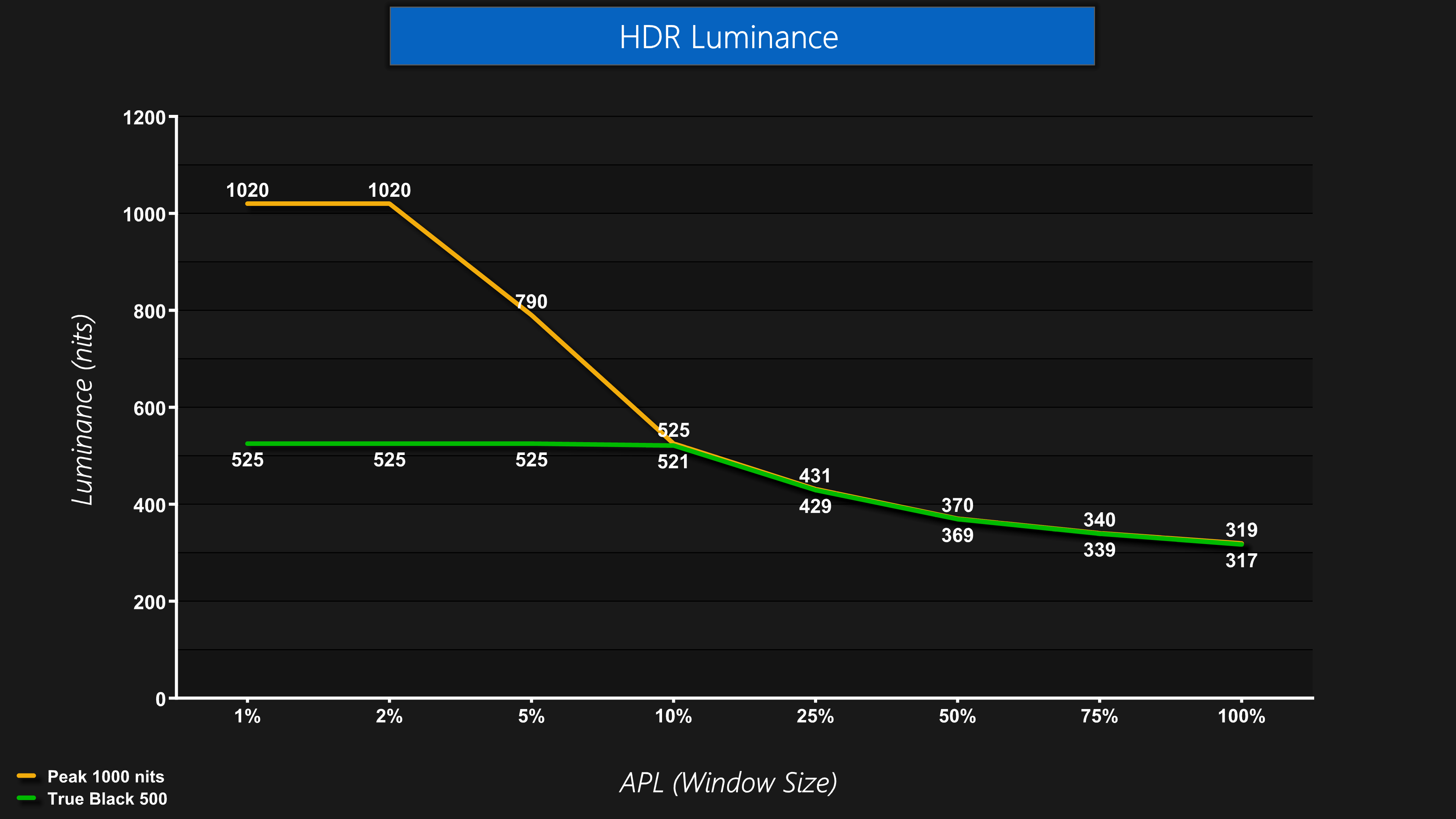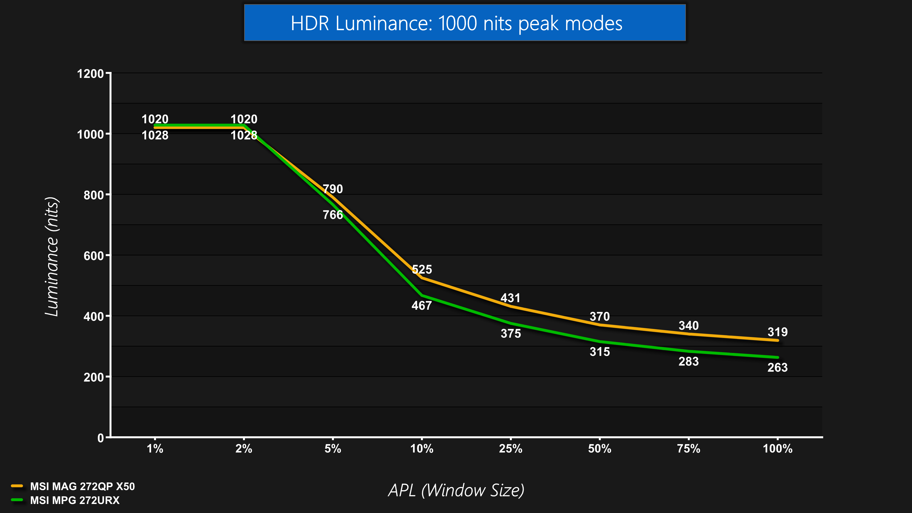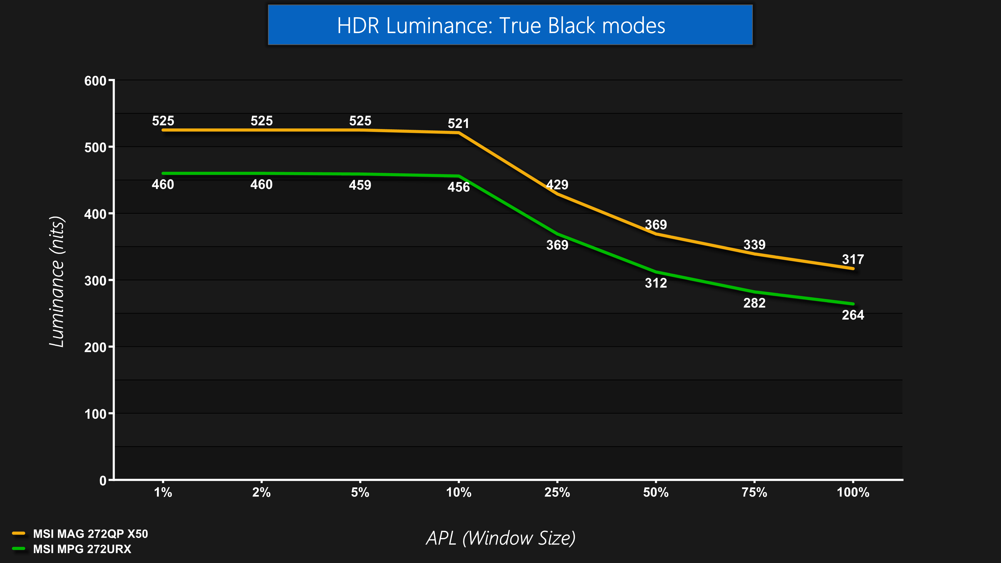 We can see that, compared to the 272URX, the new 272QP X50's True Black 500 mode is indeed a good chunk brighter than the older True Black 400 mode, regardless of APL.
