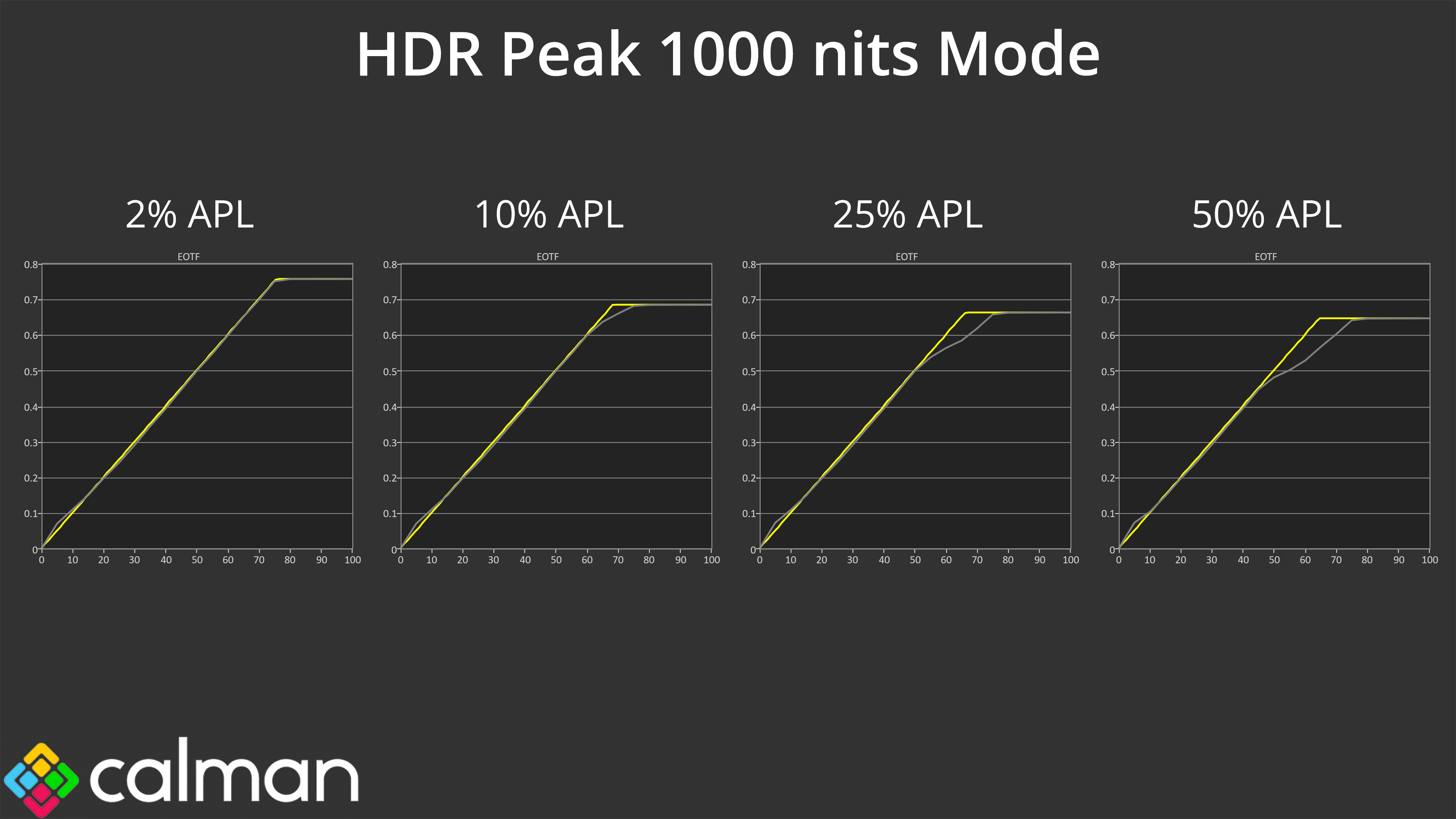 The first thing to establish is that both the Peak 1000 nits mode behaves as expected, hitting over 1000 nits at the 1% and 2% APLs, before dropping back – and the EOTF Boost mode exhibits identical behaviour.